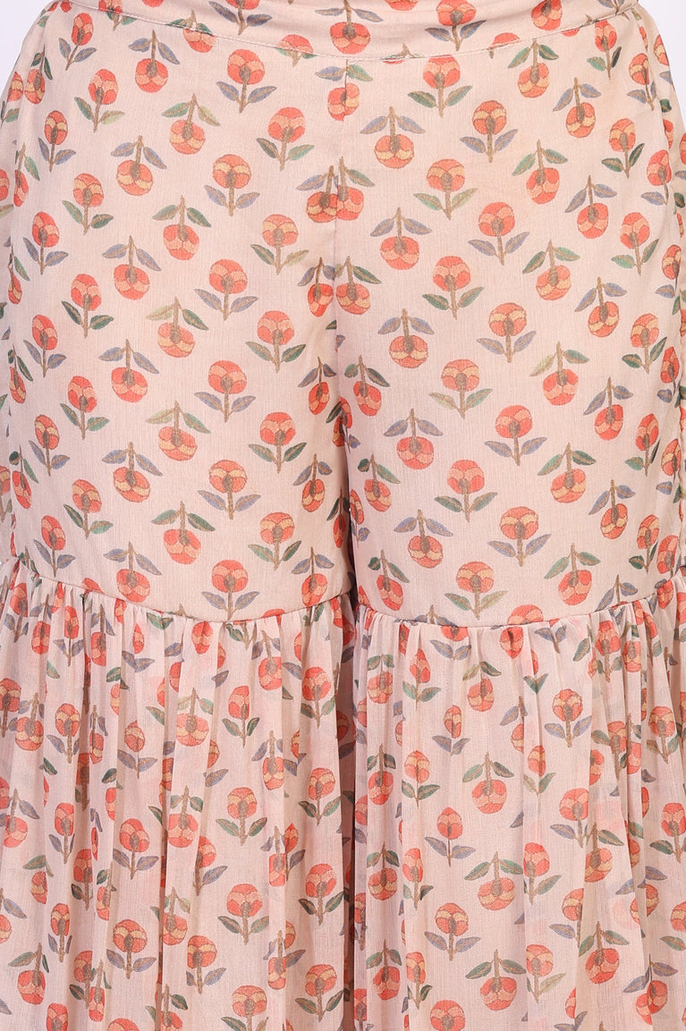 Beige Floral Embellished Peplum Chiffon Kurta with Sharara and Dupatta Set