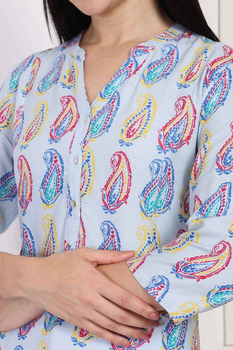 A canvas of classic artistry, this kurta for women is rendered in a refreshing Sky Paisley Blue, bringing a touch of handcrafted charm to your wardrobe. The design celebrates timeless motifs with its vibrant, all-over paisley print, making this tunic a standout piece of apparel for any casual occasion you have planned. You'll love how it's shaped into a graceful straight silhouette that flatters every form, ending in a classic straight hemline complete with side slits that offer beautiful movement and all-day ease. The neckline is a thoughtfully designed Mandarin collar, which flows elegantly into a V-placket detailed with a row of delicate, contrasting buttons on the yoke for a hint of ornamentation. Its three-quarter sleeves provide comfortable and chic coverage, perfect for transitional weather. Crafted from a fabric that glides effortlessly and feels soft against the skin, this light blue ethnic tunic is fully opaque, ensuring total confidence with every wear. It’s the perfect paisley print kurta to pair with crisp white trousers or your favorite denim for a look that's both sophisticated and wonderfully easygoing. This single-pack kurta is a testament to understated style, blending traditional patterns with a modern, wearable cut.