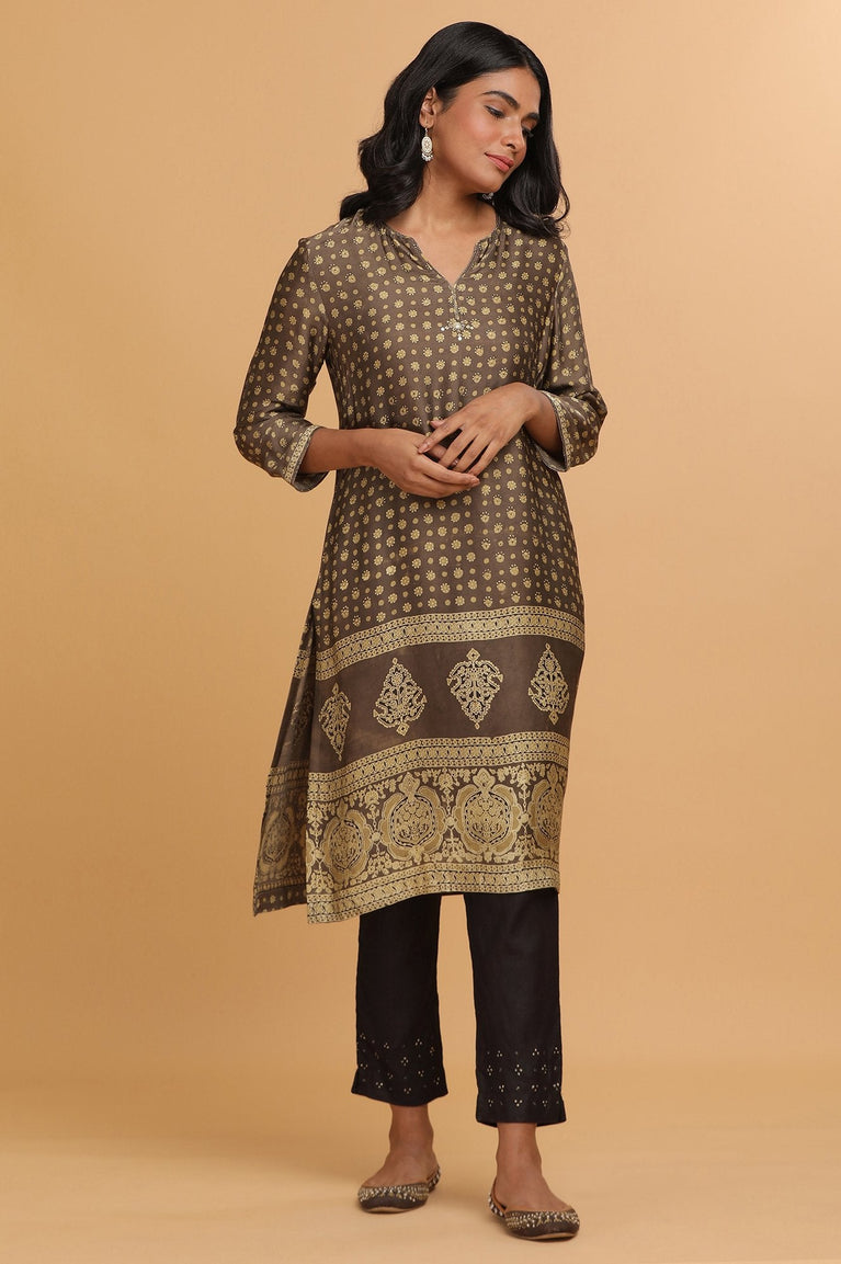 A Straight Kurta In Cotton Silk Features Geometric Zari Embroidery On The Front Panel And Lined With Soft Voile. Sleeves Are Accentuated With Stripes In The Facing And Bead Detail.