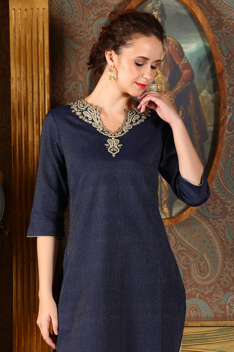 Blue Cotton Lurex Festive Kurta With Embroidered Neckine