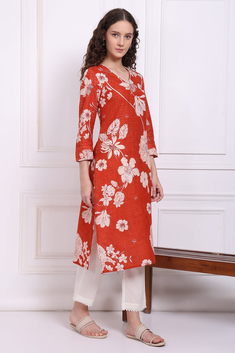 Red Solid Cotton Blend Straight Pants