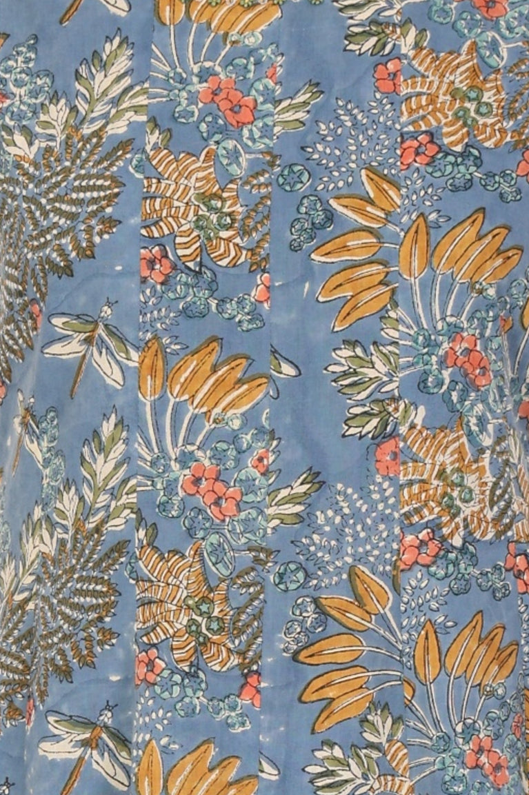 A breezy blue floral printed dress with a flared silhouette, perfect for summer outings. The sleeveless design and scoop neckline add a touch of elegance, while the embroidered gillet enhances its bohemian charm. Crafted from a lightweight cotton blend, this dress ensures comfort and style for any casual occasion.