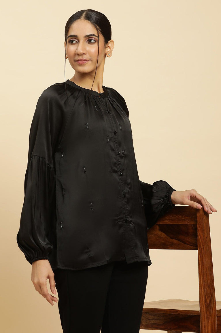 Elevate your wardrobe with this exquisite women's black top, perfect for fusion-inspired occasions. The band neckline adds a touch of sophistication, while the full sleeves provide elegant coverage. Crafted using a woven construction technique, this top exemplifies quality craftsmanship. The straight silhouette flatters various body types, making it a versatile addition to your closet. Embellished details add a glamorous touch, making it suitable for elevated events. The top is fashioned from 100% polyester, ensuring durability and easy maintenance. The satin finish gives it a luxurious sheen, enhancing its overall appeal. This fusion piece seamlessly blends traditional and contemporary styles, making it a must-have for the modern woman who appreciates cultural diversity in fashion. Whether paired with tailored pants for a formal look or styled with a skirt for a more casual ensemble, this top is sure to make a statement. Its versatility allows for numerous styling options, making it a valuable investment for your wardrobe. The black color adds a timeless elegance, ensuring that this piece remains a favorite for seasons to come.