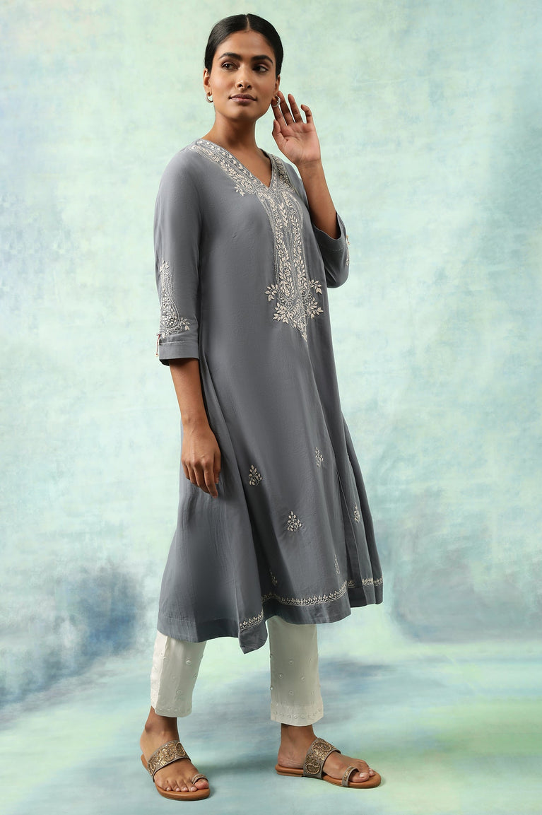 Blue A-Line Cotton Voile kurta With Elaborate Engineered Paisley Embroidery At Front And Sleeves. Further Highlighted With Interesting Shell Fish Trims On The Sleeves.