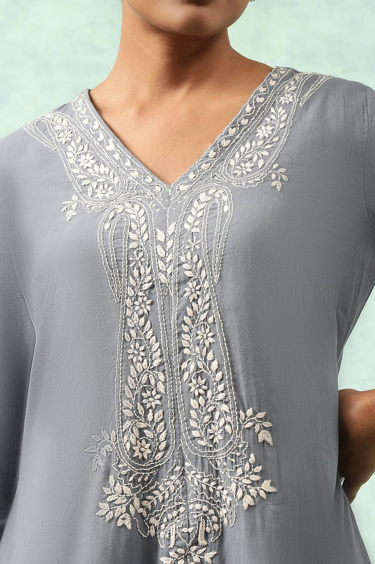 This kurta is a timeless blend of elegance and modern charm. Designed with a flattering V-neck and a detailed patti, this kurta stands out with delicate white floral embroidery, adding a graceful contrast against the rich black base. The yarn-dyed fabric enhances its texture, offering a sophisticated appeal for both casual and semi-formal occasions. Striped trim details along the neckline and sleeves lend a contemporary edge, making it a versatile wardrobe staple. Pair it with white straight pants and statement earrings for a polished look, or style it with denim for a chic fusion ensemble.