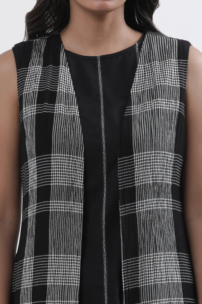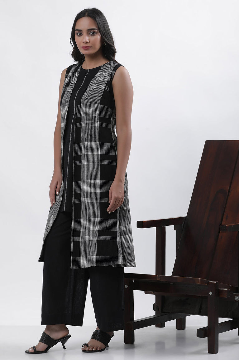 Step into structured elegance with this black co-ord set featuring a sleeveless A-line top, tailored pants and a checker print jacket. Designed for statement dressing, the monochrome palette and layered design create a refined yet modern look. Ideal for work events, dinners, or when you want to make an impression, this three-piece set is versatile and polished. The longline jacket adds definition to the outfit while the sleeveless top and pants keep it breathable. Whether worn together or styled separately, each piece offers contemporary appeal. Add this W set to your wardrobe for that effortless edge.