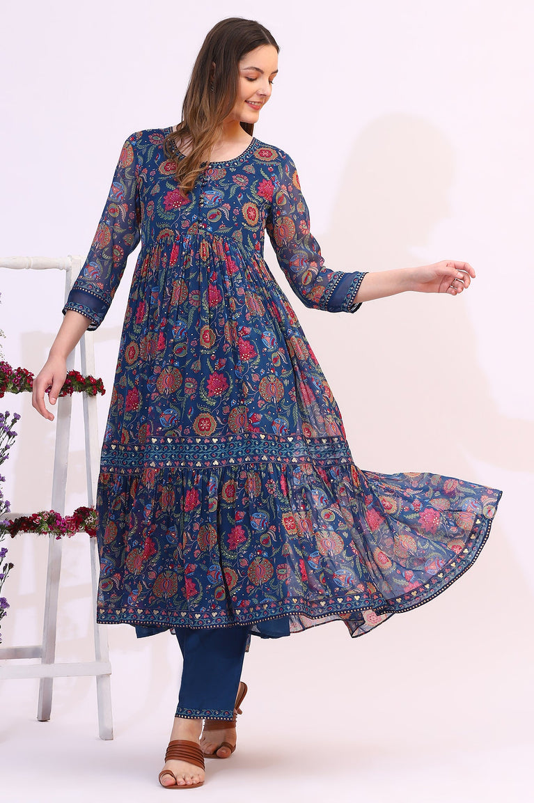 Blue Chintz Floral Printed Chiffon Anarkali Kurta