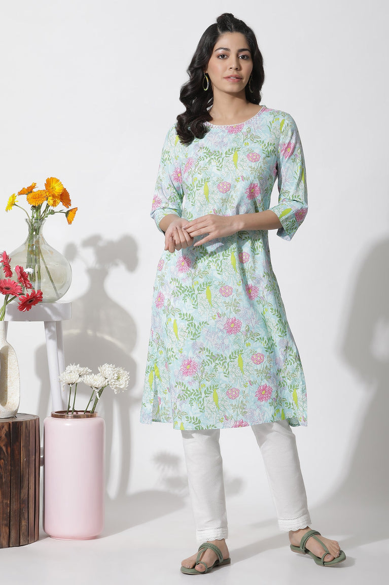 Embrace ethnic elegance with this stunning blue kurta designed for women. Crafted from 100% pure cotton, this woven masterpiece offers both comfort and style. The three-quarter sleeve length adds a touch of sophistication, while the round neckline enhances its traditional appeal. Adorned with a beautiful floral print, this kurta is perfect for casual occasions. The straight silhouette flatters various body types, making it a versatile addition to your wardrobe. This ethnic kurta seamlessly blends traditional craftsmanship with modern design, making it an ideal choice for those who appreciate both style and comfort in their everyday wear. Pair it with stylish sandals to complete the look, exuding effortless elegance. Versatile and timeless, this outfit is perfect for making a statement at any occasion, day or night.