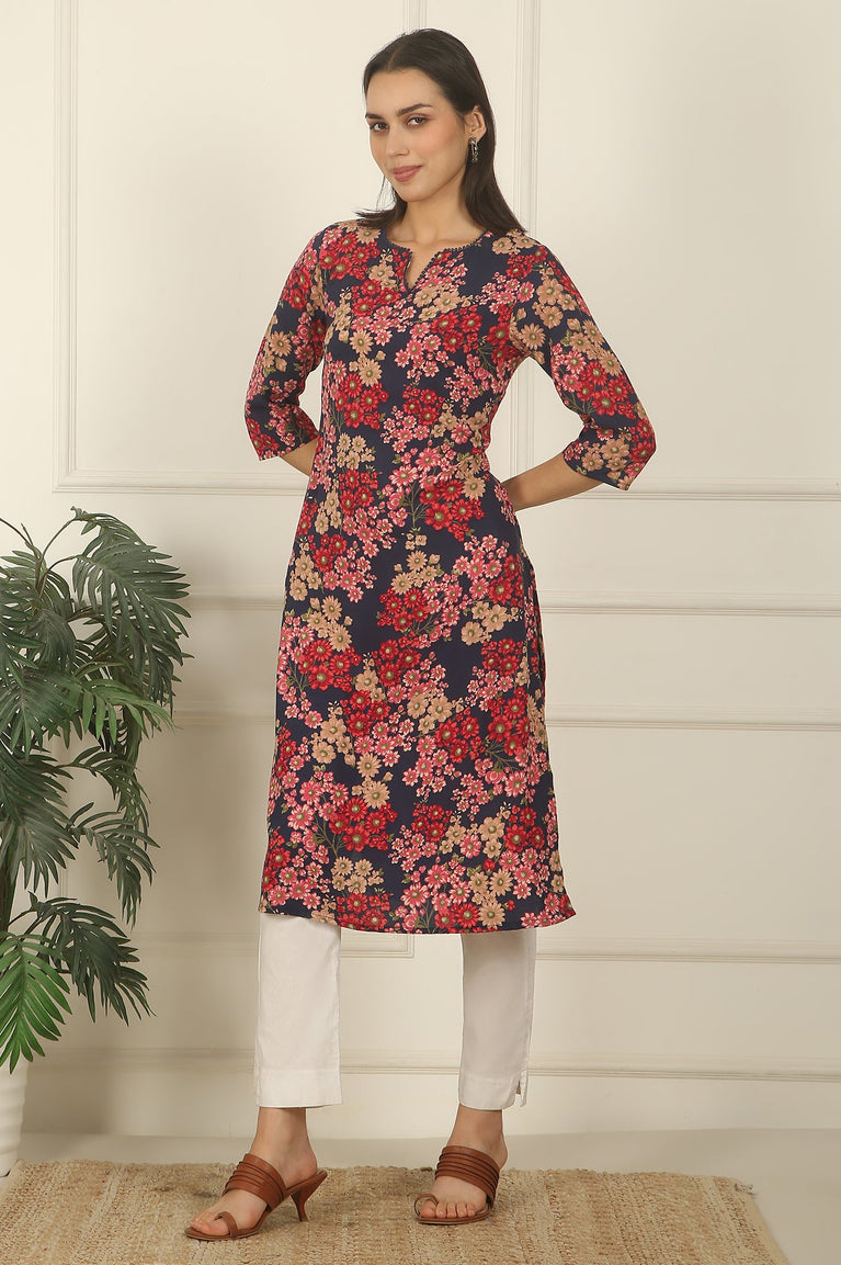 Elevate your ethnic wear game with this striking Navy Blue Floral Printed Textured Cotton Kurta. Featuring a rich combination of red, beige, and pink floral motifs, this kurta brings timeless charm to your everyday style. The straight silhouette and notched round neckline offer a classic touch, while the three-quarter sleeves make it versatile for both workwear and casual settings. Crafted from soft, breathable cotton, this kurta guarantees all-day comfort. Pair it with white trousers and statement earrings for a polished, graceful ensemble.