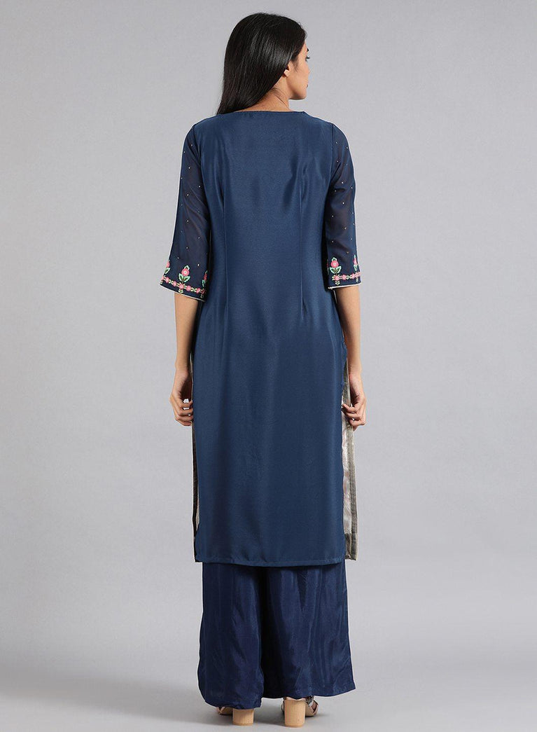 Blue and green round neck 3/4 sleeve kurta with placement print and embroidered sleeves.