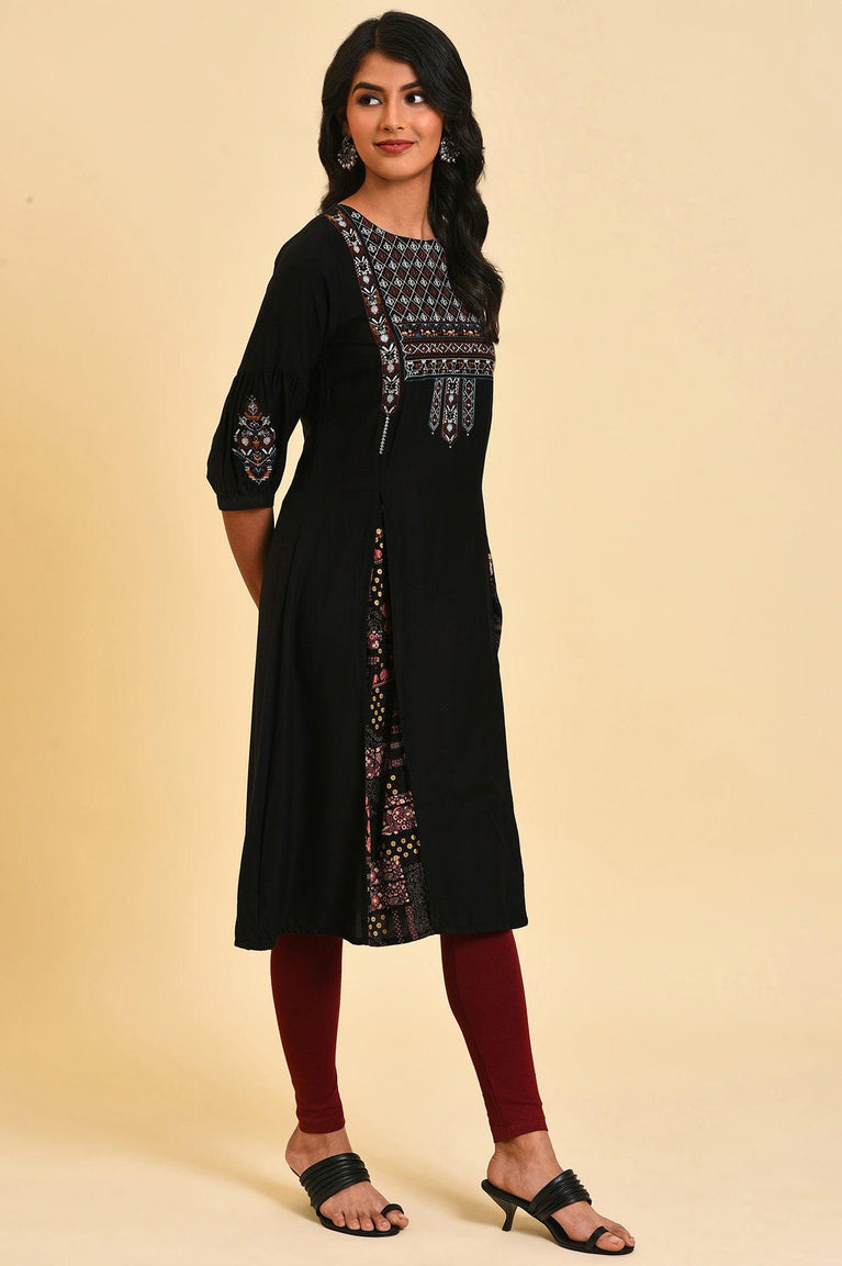 Black Solid Multi Color Layout Embroidered Printed Godget Tunic. The Top-Wear Has Round Neck And Three-Quarter Sleeves.