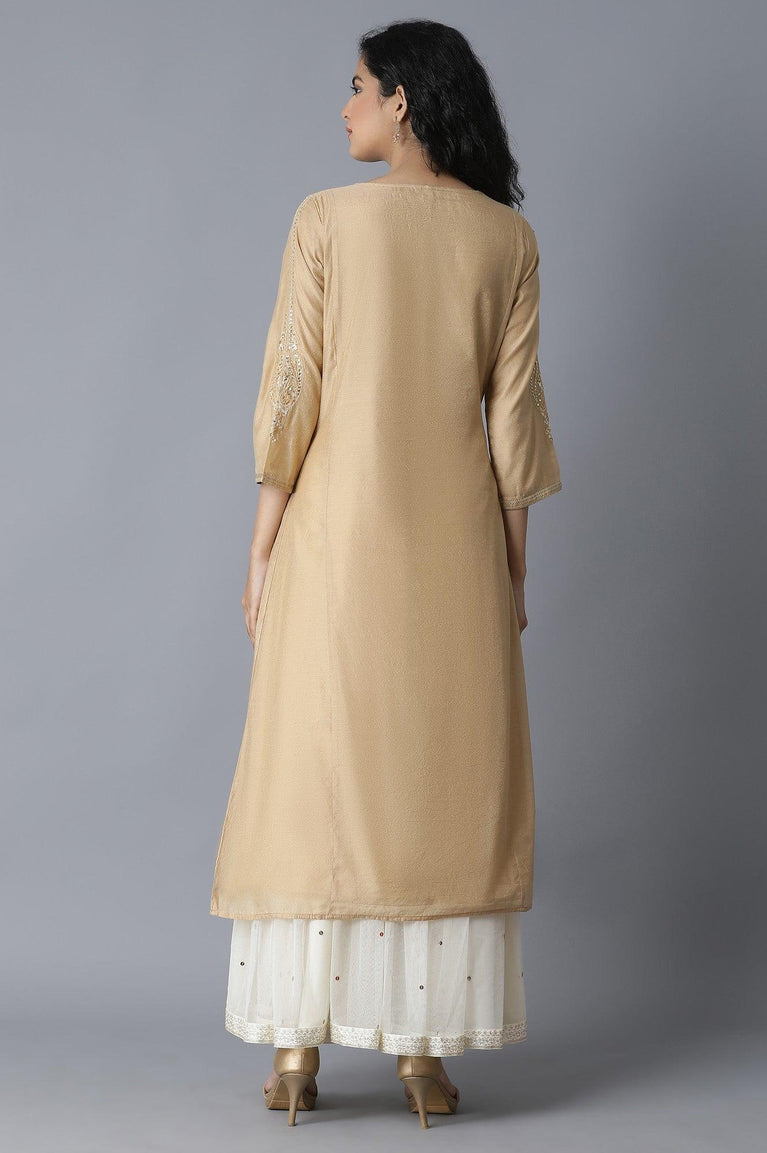 Beige glitter print kurta with embroidery on centre front. The kurta has mandarin collar and three-quarter sleeves.