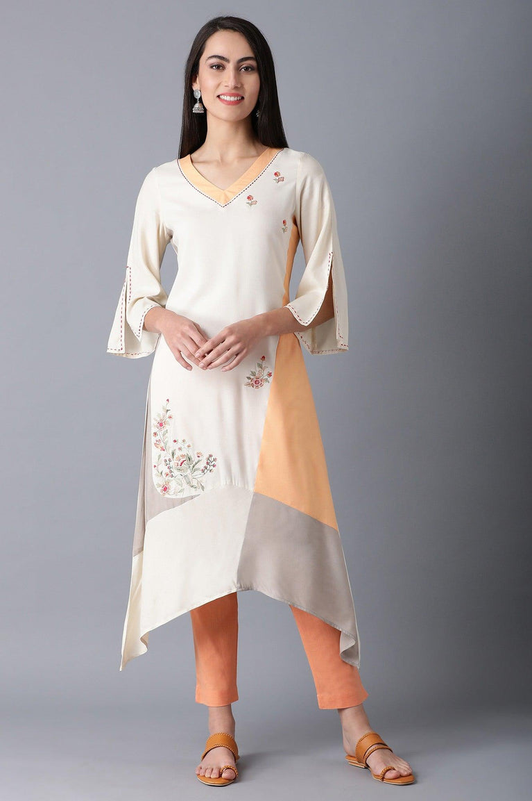 Beige A-line dipped kurta with floral embroidery and color blocking at hem. The kurta has V-neck and three-quarter cutaway sleeves.
