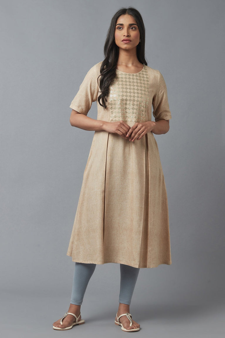 Beige Bead Embroidered Viscose Silk Tussar Kurta