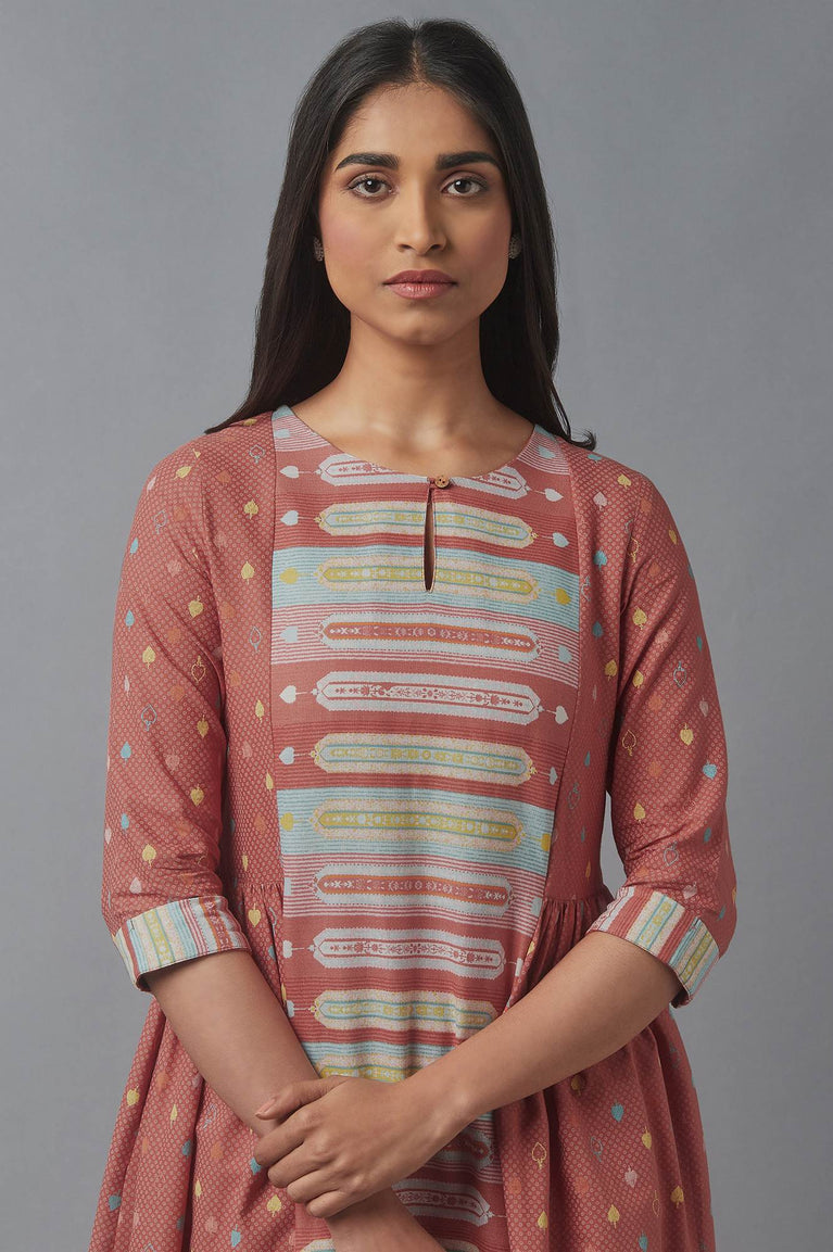 Flared silhouette contemporary Indian kurta featuring geometric print and has printed patch at front and on sleeves hem. The kurta has round neckline and button closure.