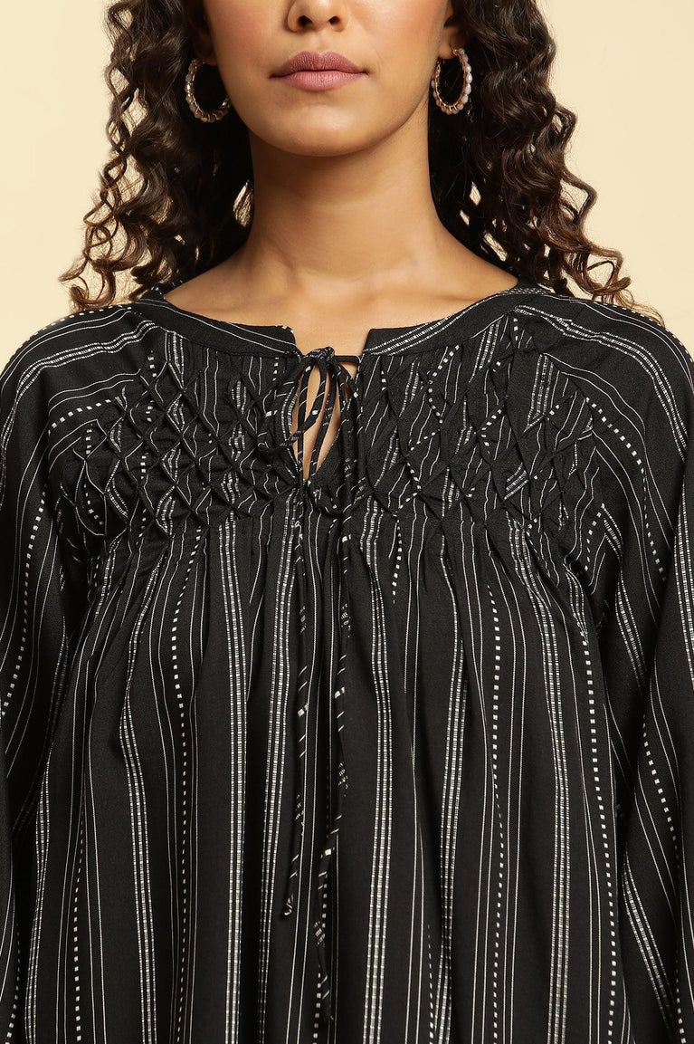 Black Dobby Stripes Top With Smocking Detail And Tie-Up Neck. This Top From W'S Western Wear Capsule Is A Must-Have For Your Casual Wear Wardrobe.