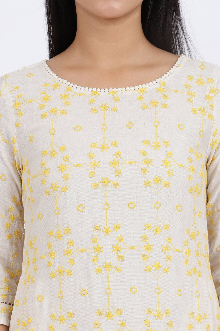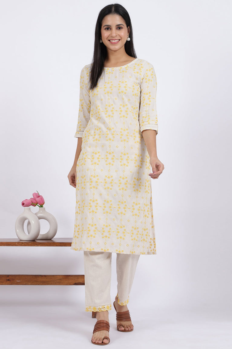 Beige Floral Straight Cotton Kurta