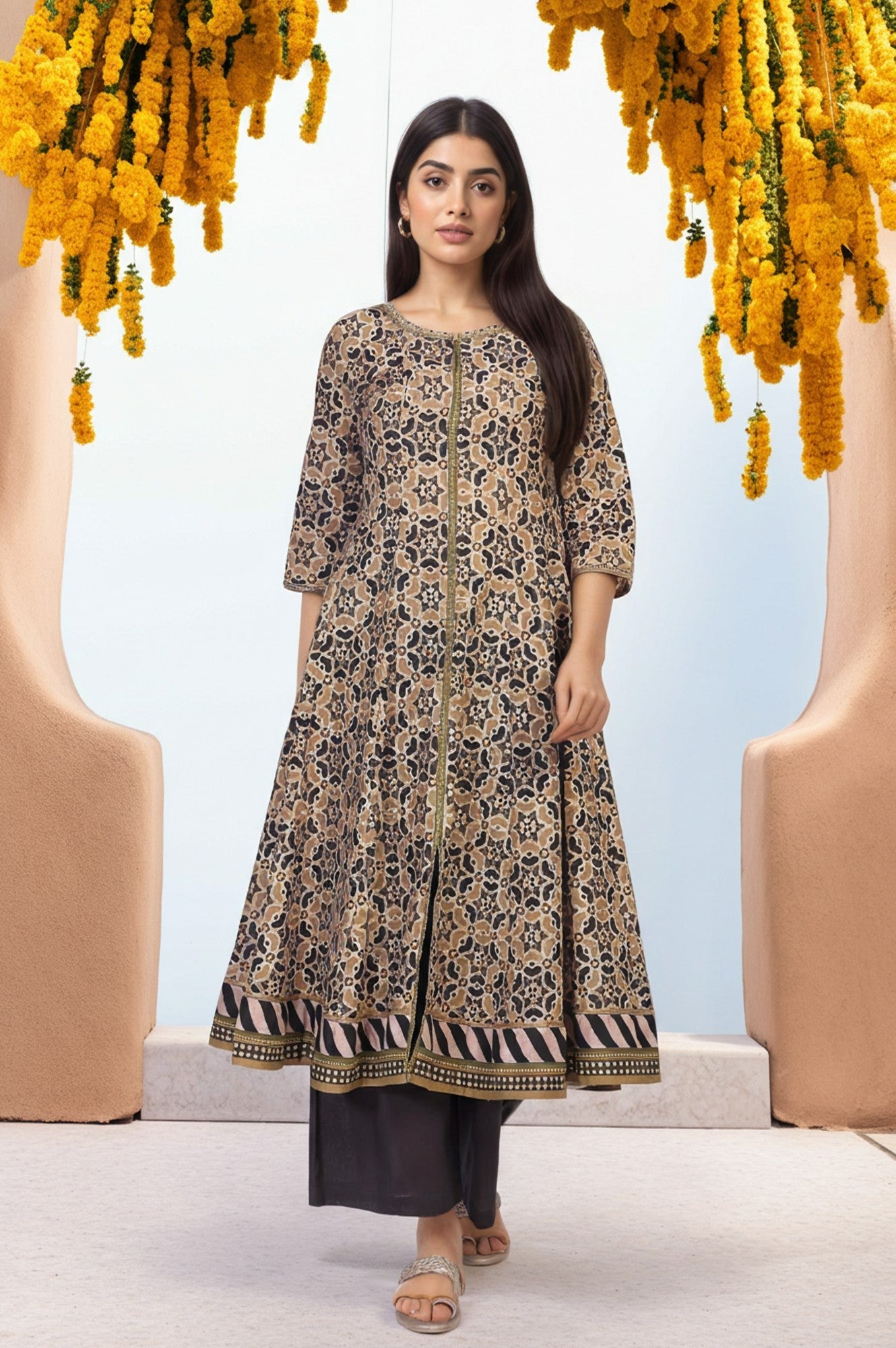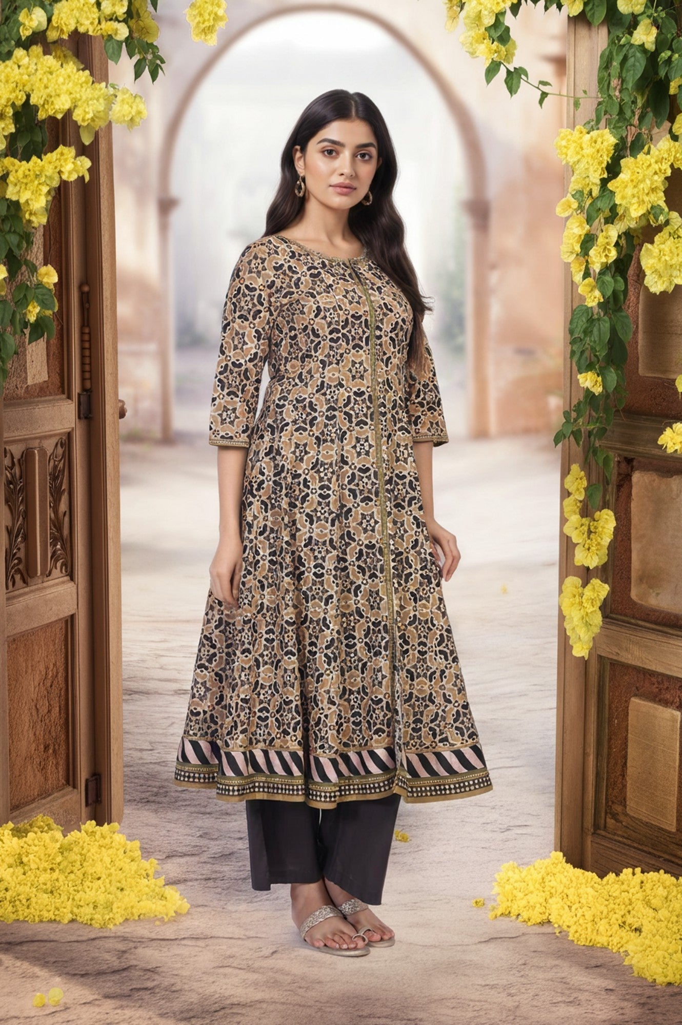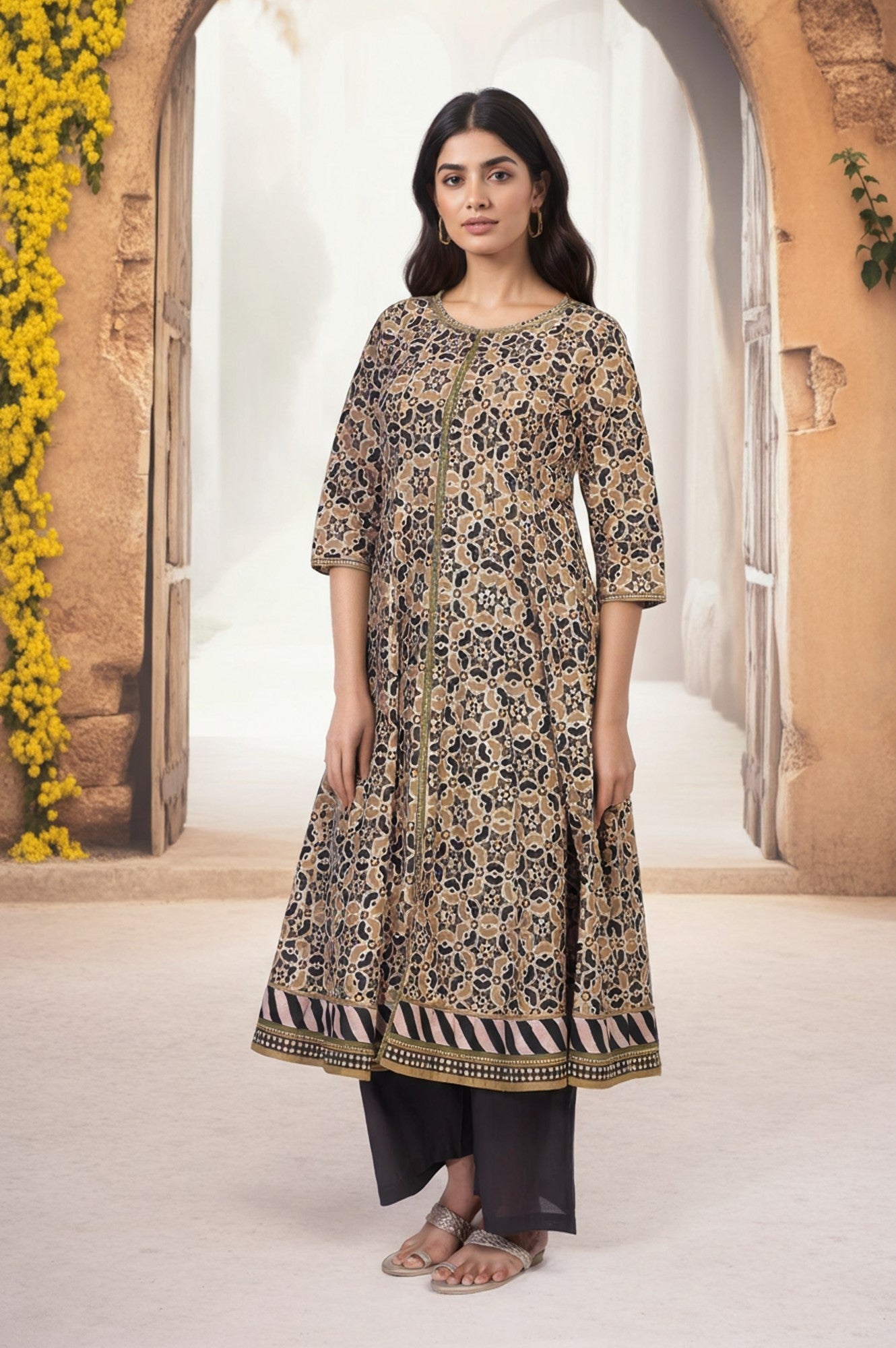 A portrait of heritage and modern grace, this Anarkali kurta set for women is a masterpiece of sophisticated design, perfect for those who appreciate artisanal details. The ensemble features a beautifully flared tunic, rendered in a striking geometric block print that dances across the premium cotton fabric in a palette of earthy beige, deep black, and muted olive. It’s an ethnic co-ord set that tells a story with every motif. You’ll absolutely adore the elegant round neckline, which is delicately highlighted with fine, lustrous embroidery that traces a central front placket. This detail flows seamlessly into a contemporary full-length front slit, a modern touch that adds both visual intrigue and graceful movement to the classic Anarkali silhouette. The comfortable three-quarter sleeves are finished with a simple, clean hem, complementing the ensemble's refined aesthetic. This exquisite kurti set ensures all-day comfort without compromising on style. At the flared hemline, a broad, contrasting border featuring bold stripes provides a perfect visual anchor to the intricate all-over pattern. The set includes a pair of solid, dark-toned parallel pants that offer a sleek, comfortable fit, perfectly balancing the volume of the kurta. This opaque, two-piece set is a testament to timeless elegance.