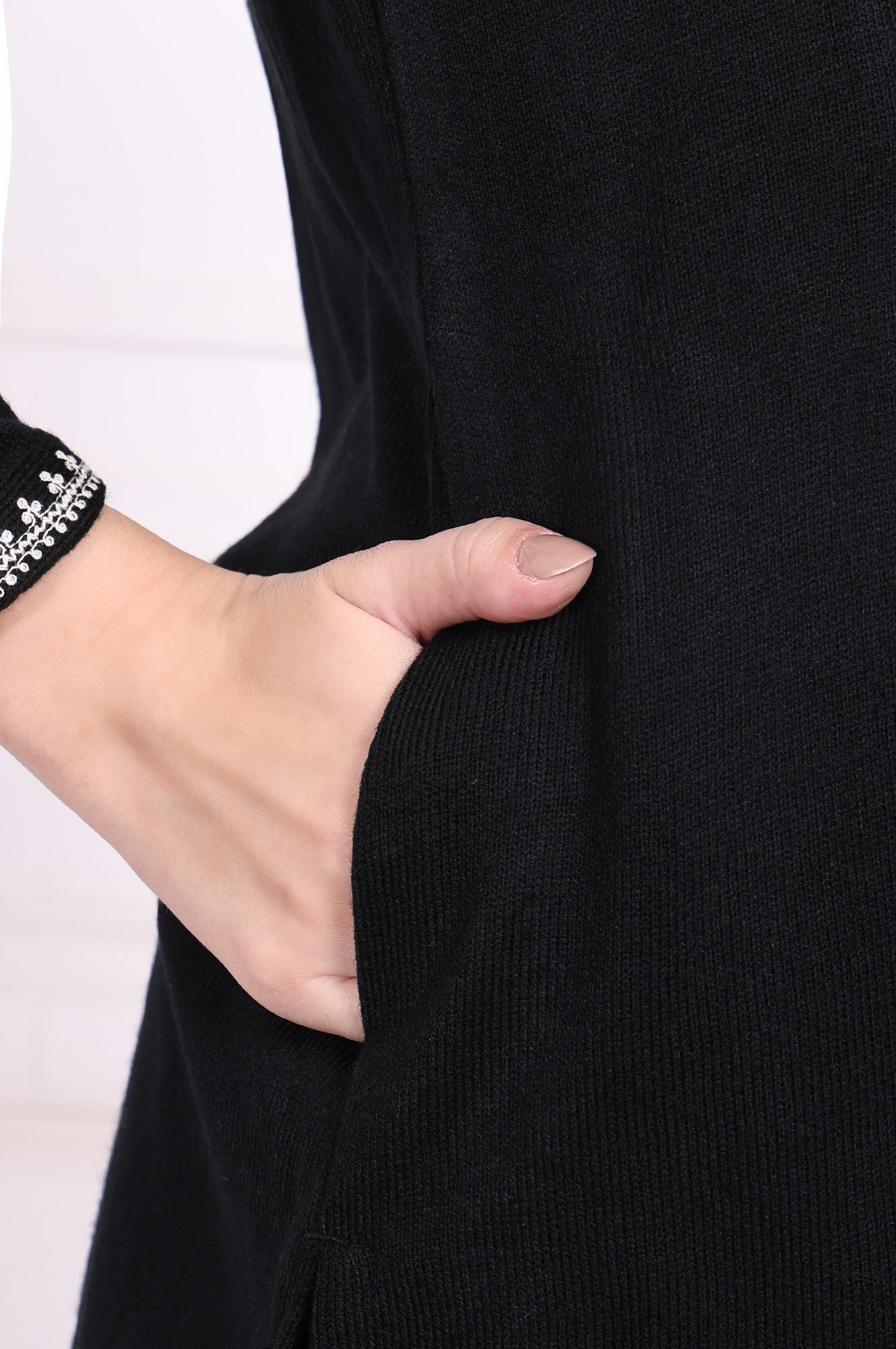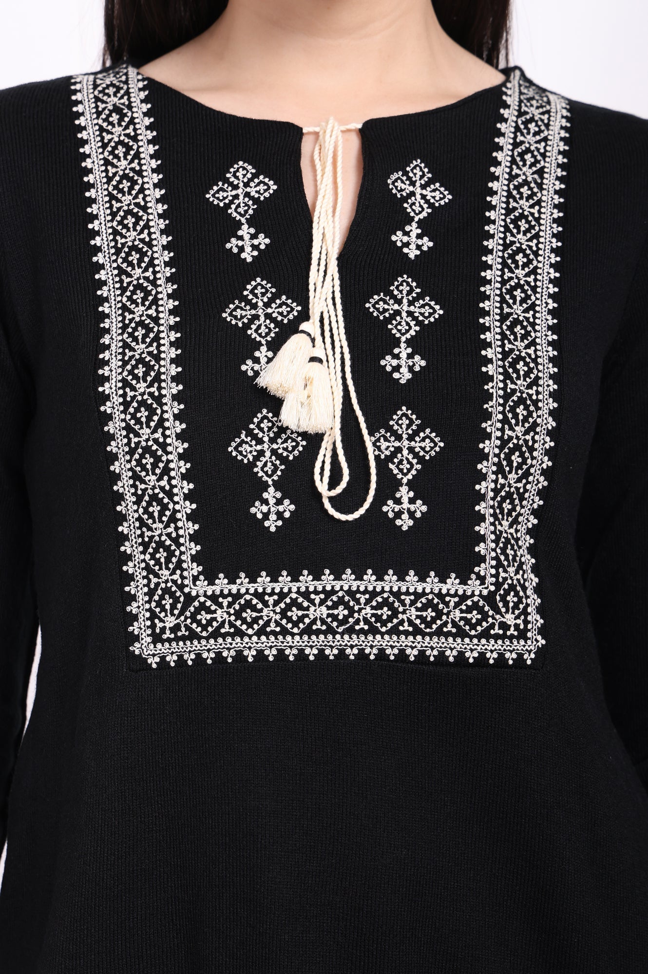 Timeless grace meets cozy comfort in this stunning black tunic, a true masterpiece of winter wear. Crafted from a wonderfully soft acrylic knit, it's the perfect companion for chilly days, offering enveloping warmth without sacrificing an ounce of style. The intricate white ethnic embroidery on the yoke frames the face beautifully, creating a striking contrast that captures the eye and speaks to artisanal heritage. This elegant tunic for women is designed around a charming keyhole neckline, which is further detailed with delicate, handcrafted tassels that add a playful and bohemian touch to the sophisticated design. You'll find the full-length sleeves are finished with matching embroidered borders at the cuffs, echoing the central design for a wonderfully harmonious and polished appearance. Its silhouette is a classic straight cut that flatters any figure, flowing gracefully to a straight hemline, while side slits ensure complete ease of movement. As a perfectly practical touch, it includes discreet side seam pockets. Entirely opaque for confident wear, this winter tunic masterfully combines traditional artistry with contemporary design, making it an effortlessly chic choice for casual outings or relaxed festive gatherings. It’s the kind of versatile apparel you’ll reach for again and again.