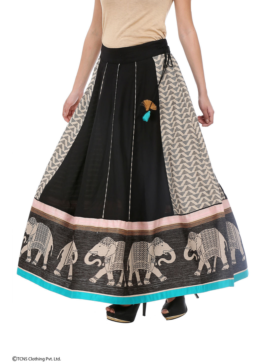 This black and beige printed skirt has printed detail, elasticated back, side zip with tie-up detail and flared hemline.