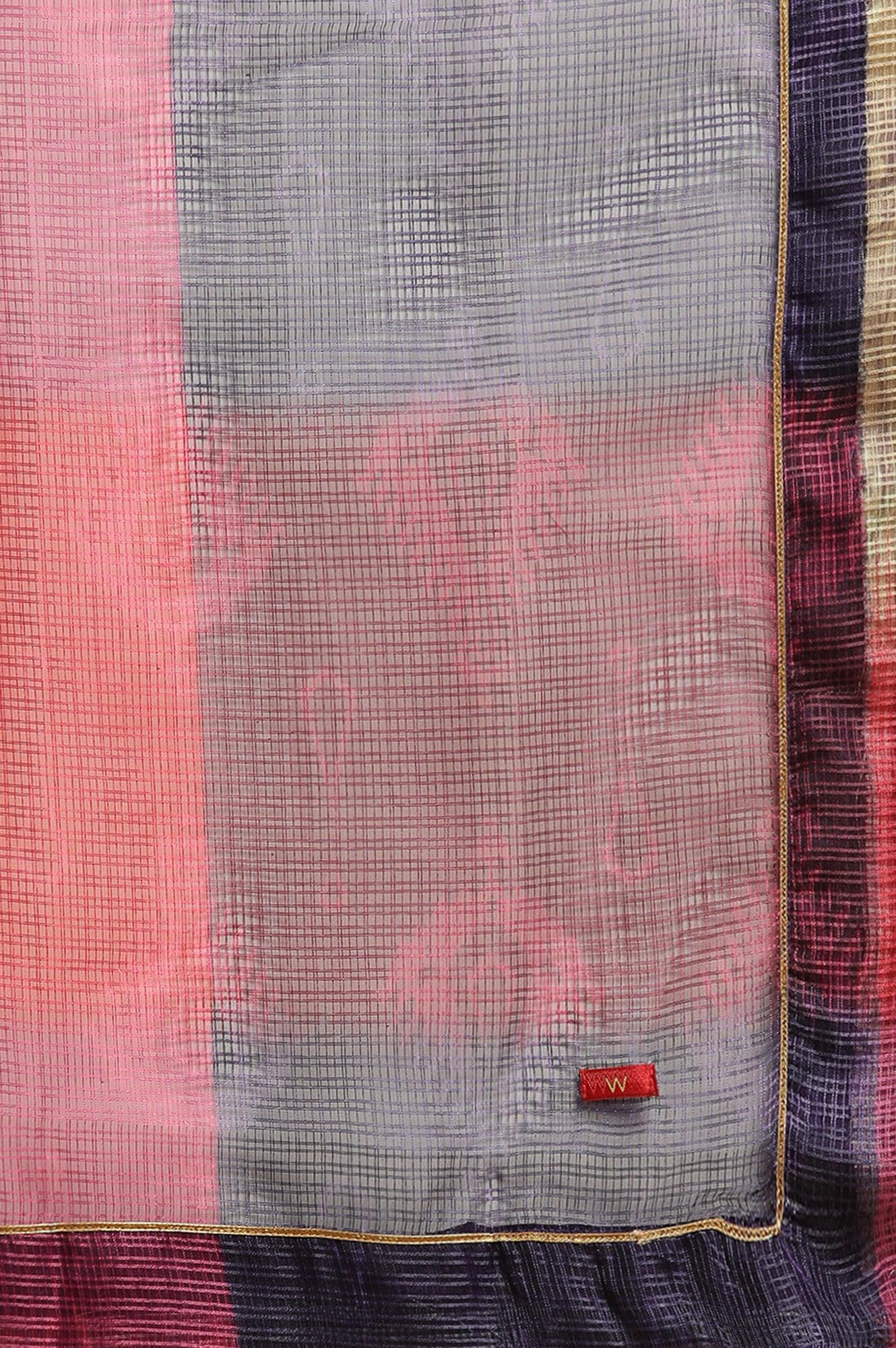 With The Hints Of Purple Colours, This Multi-Coloured Printed Kota Dupatta With Soild Facing And Metallic Sequin Detailing.