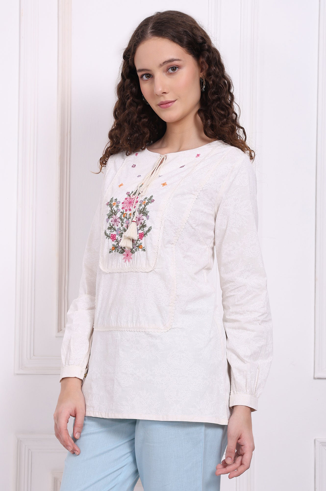 Add a touch of elegance to your everyday style with this textured cotton top with embroidered yoke. Crafted from soft and breathable pure cotton, the top features a subtle self-textured weave that enhances its visual appeal. Intricate tonal embroidery on the front lends a refined, handcrafted charm, while the delicate lace accents along the neckline and sleeves add a feminine finish. Designed in a relaxed silhouette for ease and comfort, this versatile piece is perfect for work, casual outings, or summer brunches. Pair it with jeans, trousers, or ethnic bottoms for a fresh and graceful look.