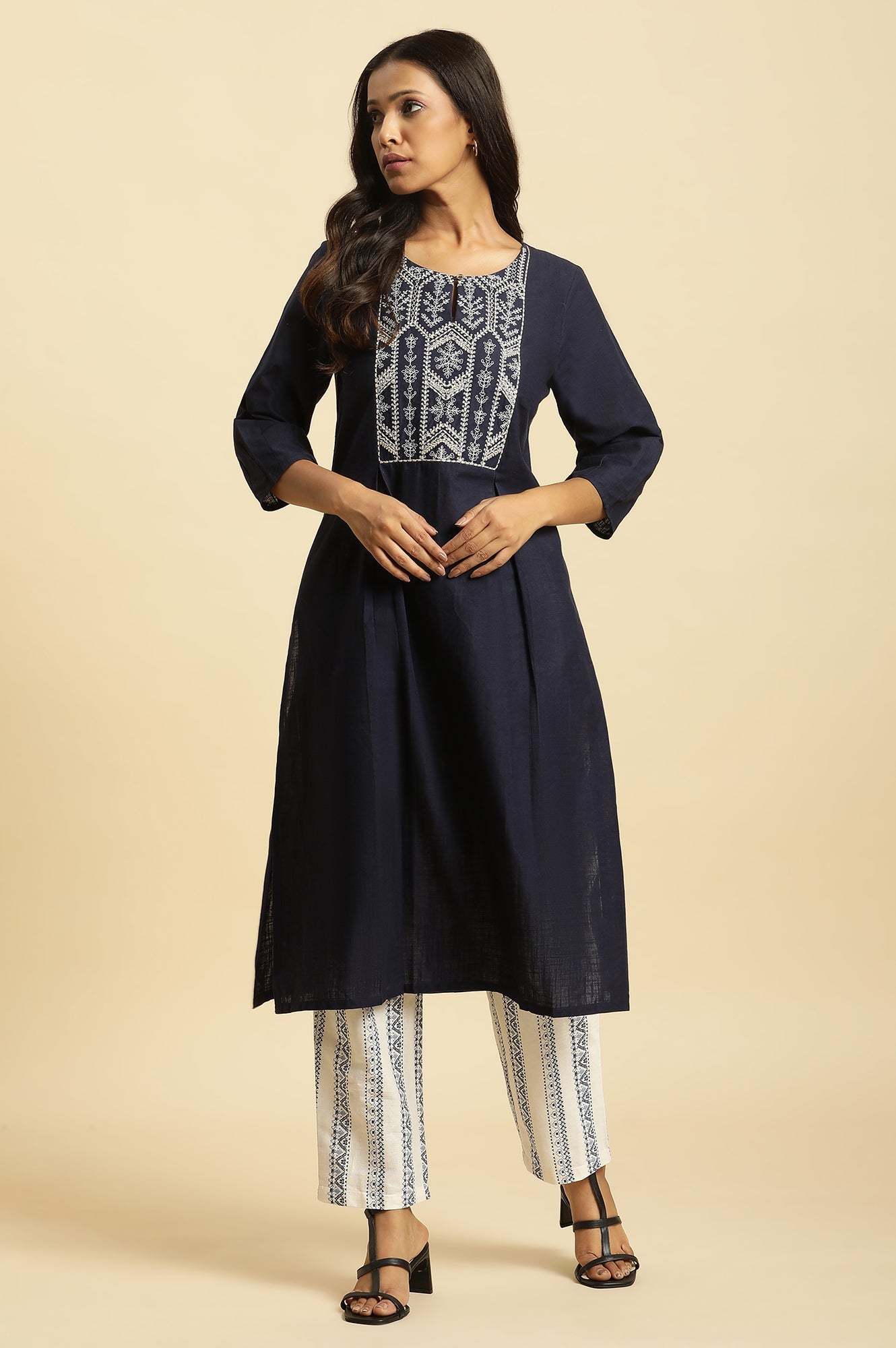 Geometric White And Blue Printed Straight Pants. These Mid-Rise Pants Feature A Partially Elasticated Waistband For A Comfortable Fit.