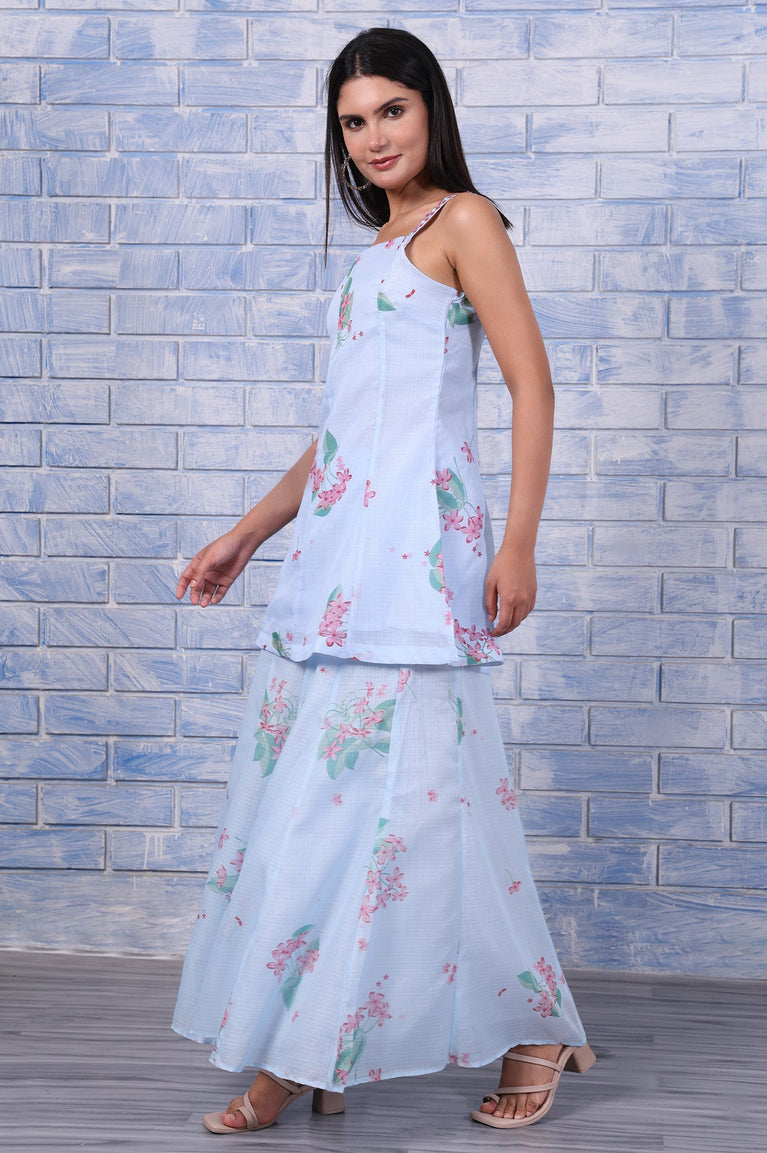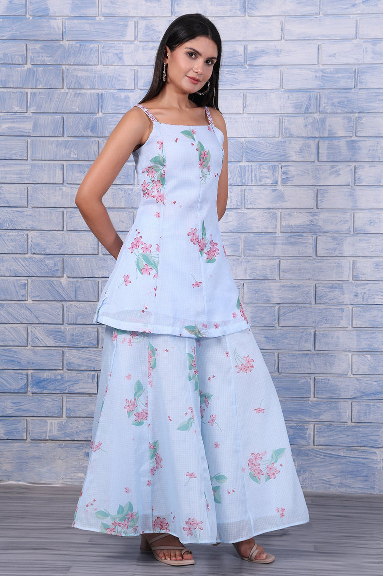 Blue Floral Printed Thread Embroidered Kota Flared Kurta, Flared Pant And Dupatta Set