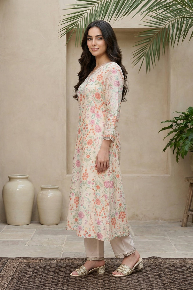 Soft and sophisticated, this straight kurta and slim pant set is crafted from pure cotton for breathable comfort. The beige base features delicate floral prints, lending a natural elegance perfect for everyday and festive wear. The straight silhouette creates a clean, tailored finish, while slim pants add a modern edge. This cotton kurta set for women is a versatile choice for workdays, lunches, or casual gatherings, combining effortless style with practicality. The pure cotton fabric keeps you cool and comfortable throughout the day, while the neutral palette offers endless accessorising possibilities. Whether styled simply for an understated look or dressed up for special occasions, this set is a dependable staple for every season. The blend of timeless prints and natural tones makes it a must-have for the modern ethnic wardrobe.