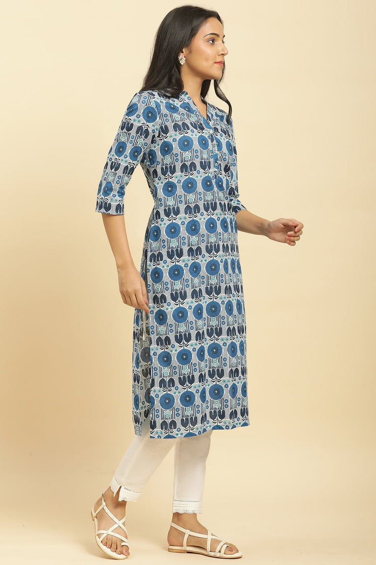 Embrace ethnic charm with this casual blue kurta for women. Made from 100% pure cotton, it offers breathability and comfort for all-day wear. The woven construction technique ensures longevity, while the geometric print adds a contemporary flair. The straight cut flatters your silhouette, and the three-quarter sleeves provide a balanced look. The mandarin collar adds a touch of sophistication to this ethnic piece. Ideal for casual occasions, this cotton kurta combines style and comfort seamlessly. Pair it with stylish sandals to complete the look, exuding effortless elegance. Versatile and timeless, this outfit is perfect for making a statement at any occasion, day or night.