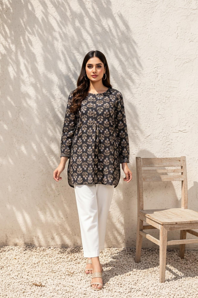 A timeless addition to your wardrobe, this black floral printed cotton top is perfect for any occasion. The soft cotton voile fabric ensures breathability and comfort, making it ideal for all-day wear. Featuring a round neckline and 3/4 sleeves, this top is designed with an elegant A-line silhouette that flatters every body type. The intricate floral print adds a touch of bohemian charm, while the lightweight material makes it perfect for casual outings, college wear, or festive gatherings. Pair it with white trousers or denim for a chic and versatile look.