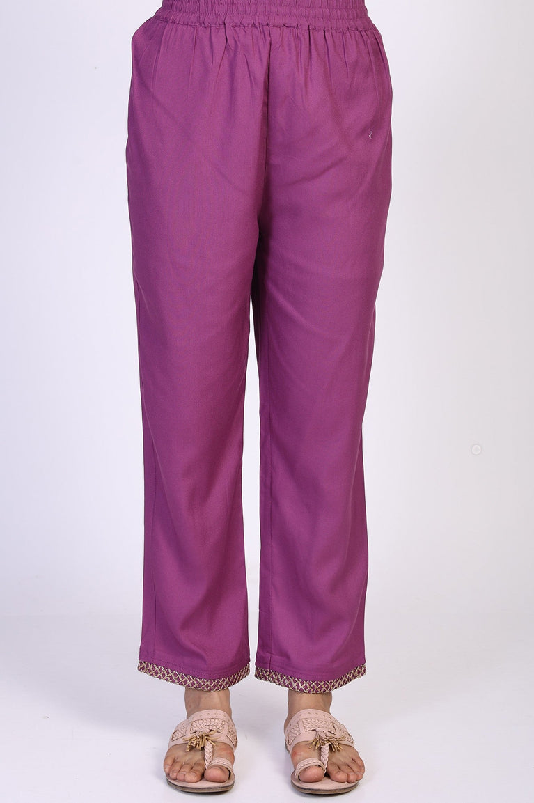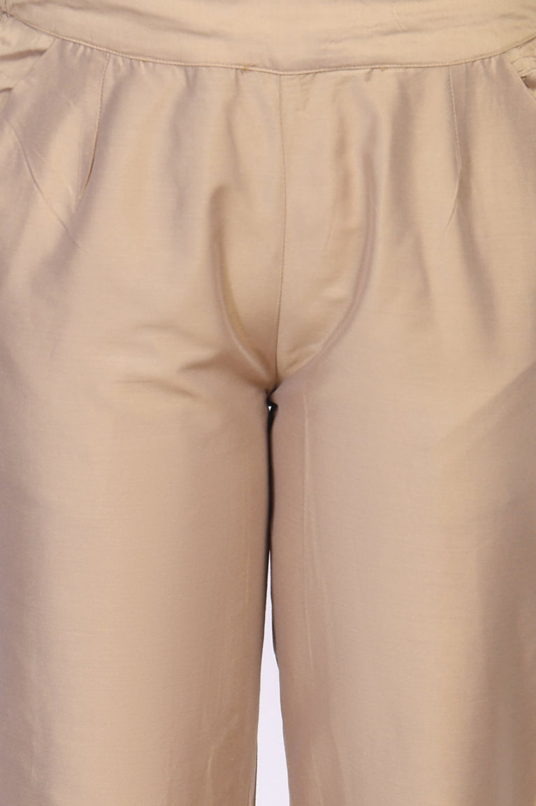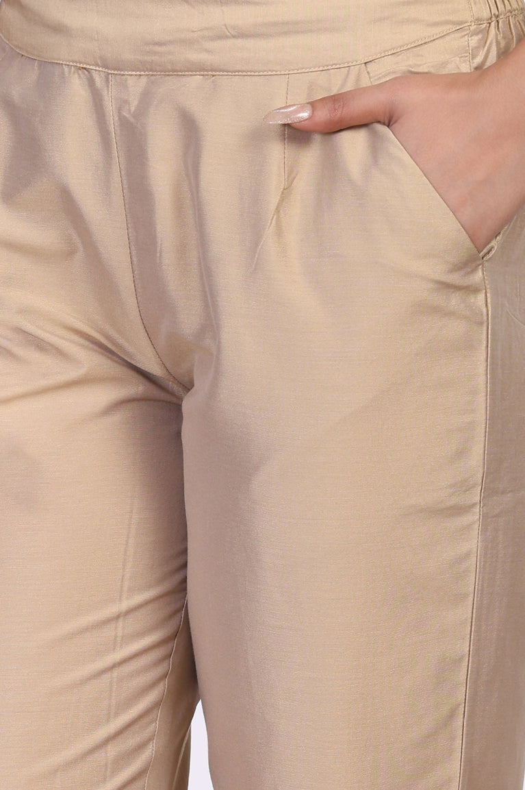 A masterclass in minimalist ease, these trousers for women are designed for the modern woman who values both impeccable style and absolute comfort. Tailored in a versatile and earthy Subtle Beige, they serve as the perfect canvas for a multitude of creative looks, from pairing with vibrant ethnic kurtas to styling with crisp, casual western tops. These elegant women's pants feature a comfortable mid-rise cut that sits perfectly on the waist, flowing gracefully into a chic straight-leg silhouette that flatters every frame. The design prioritizes effortless wearability; the fully elasticated waistband ensures a flexible fit and makes them wonderfully simple pull-on trousers with no fussy closures to worry about. Delicate pleats at the front add a subtle touch of tailored dimension without adding any bulk to the clean lines. For everyday functionality, two discreet slit pockets are seamlessly integrated into the side seams, perfect for keeping small essentials close at hand. The length is fashionably cropped, ending precisely at the ankle with a clean, neatly stitched hem. This contemporary cut is ideal for showcasing your favorite footwear, from ornate sandals to sleek loafers. You’ll absolutely adore the feel of the soft, smooth fabric that drapes beautifully and moves with you throughout a busy day. These ladies’ trousers are more than just a garment; they are a foundational piece for a sophisticated wardrobe, offering endless styling possibilities.