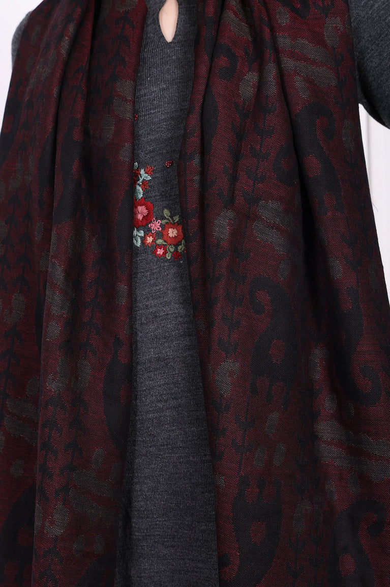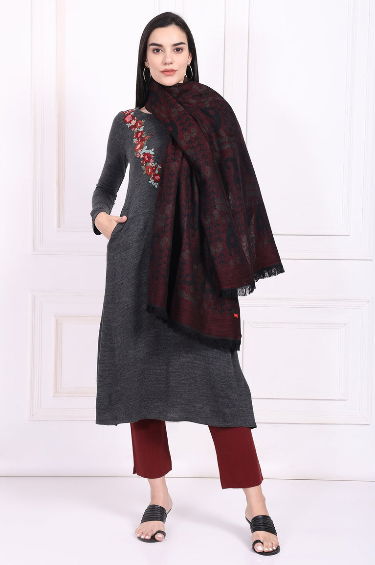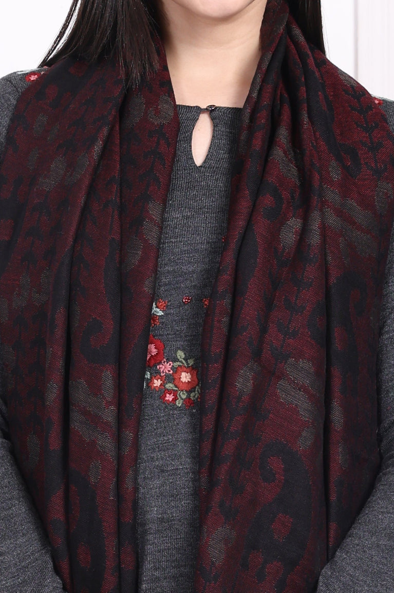 When tradition weaves itself into modern style, you get a piece as captivating as this. This designer stole for women is more than just an accessory; it’s a statement of quiet elegance. Crafted from a premium blend of soft cotton and warm wool, it feels delightful against the skin, promising comfort on crisp days. The stole's canvas is a deep, mysterious black, brought to life by an intricate all-over pattern in a contrasting shade of rich maroon. This beautiful ethnic stole features woven paisley-inspired motifs, a testament to its yarn-dyed craftsmanship that ensures the design is part of the fabric's very soul. With a generous length of 1.8 metres and a width of 70 cm, this opaque wrap offers endless styling possibilities – drape it artfully over a kurta, wrap it snugly for warmth, or let it cascade down for a dramatic effect. The texture is sublime, and the drape is fluid, making it a joy to wear. Its edges are finished with a delicate fringe, adding a classic touch to this sophisticated piece. As a versatile stole for women, it’s perfect for both festive occasions and elevating your daily winter look. This is the black and maroon woven stole you'll cherish for seasons to come.