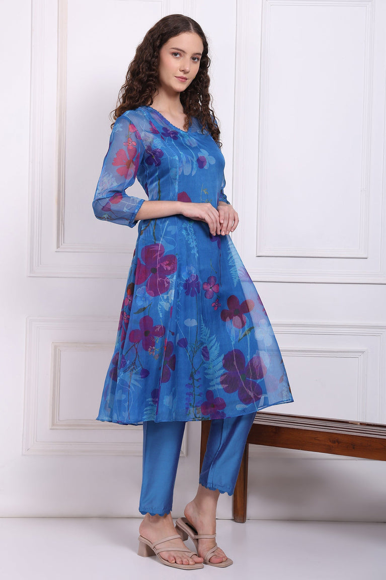 Blue Floral Printed Organza Flared Kurta, Pants and Dupatta Set