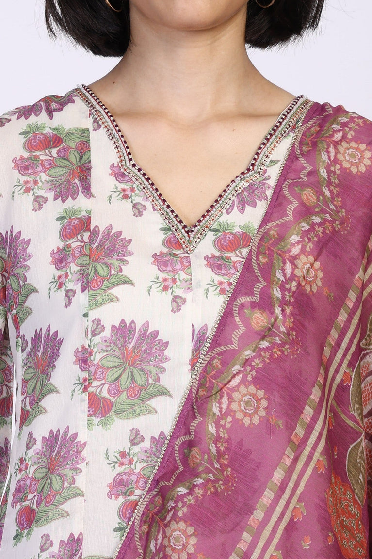 Beige Floral Print Sequined Flared Chanderi Kurta with Pant and Dupatta Set