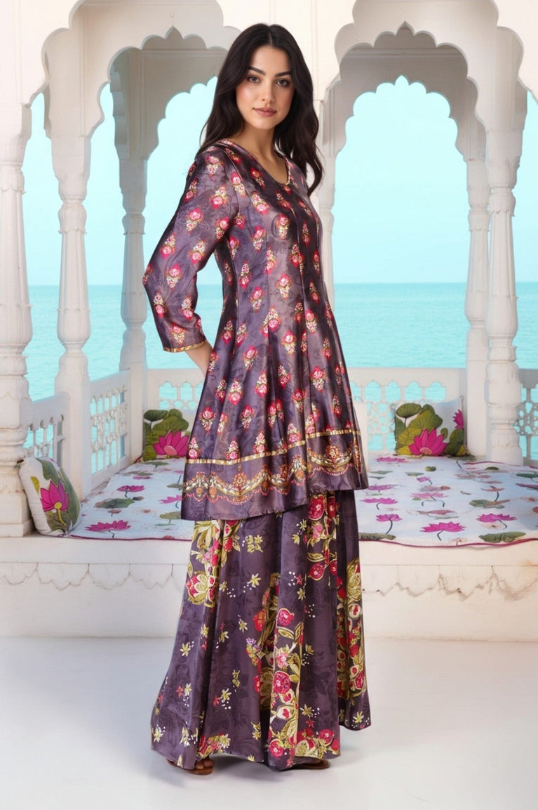 Sunlit elegance meets timeless charm in this beige floral printed kurta set. Featuring a sequined V-neckline, three-quarter sleeves, and a flared silhouette, it pairs beautifully with vibrant purple pants and a matching dupatta. Perfect for festive occasions and casual outings alike.