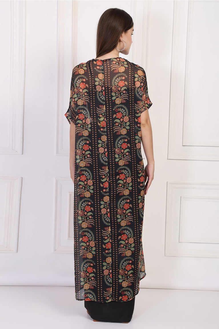 A silhouette that dances between tradition and trend, this stunning ensemble redefines celebratory style. The core of this exceptional kurta set for women is a chic crop top, brought to life with a dense, artistic floral print on a dramatic black base. You'll find its flattering V-neckline is meticulously traced with a delicate, shimmering border, a subtle touch of opulence. But the true showstopper is the matching sheer cape, an ethereal layer that flows to the floor, echoing the top's vibrant pattern and finished with the same elegant trim. Its kaftan-style sleeves offer a relaxed, breezy feel, perfect for an evening of festivities. This unique kurti set is beautifully balanced with a solid black skirt. Masterfully designed with pleats and drapes, the skirt creates a fluid, graceful movement that feels as incredible as it looks. As an ethnic co-ord set, this trio offers endless versatility for your wardrobe. The opaque top has a clean, straight hemline, while the cape drapes asymmetrically for added drama. This complete look, including the top, cape, and skirt, is a masterpiece of fusion design. It’s a sophisticated alternative to the classic kurta pant set with dupatta, crafted for making an unforgettable entrance at any party or special occasion.