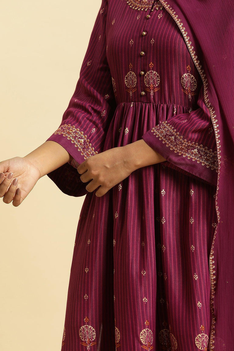 Purple Embroidered Glitter Printed Rayon Flared Kurta and Pants Co-ord Set
