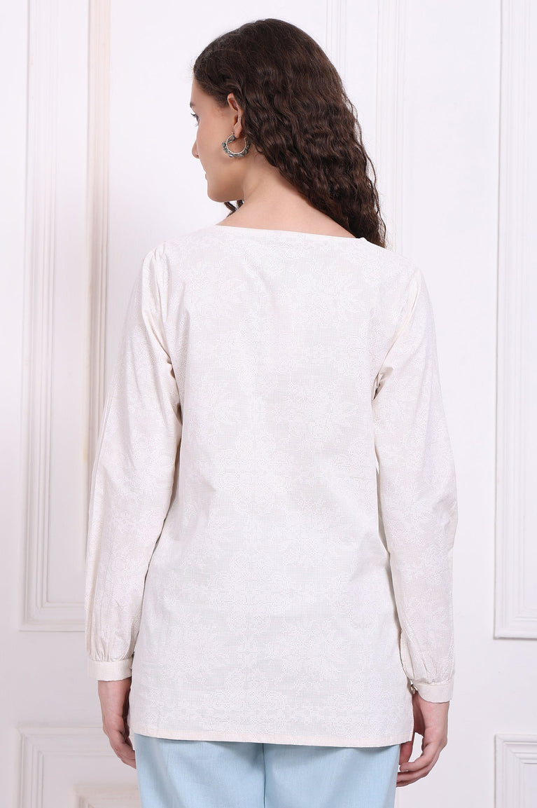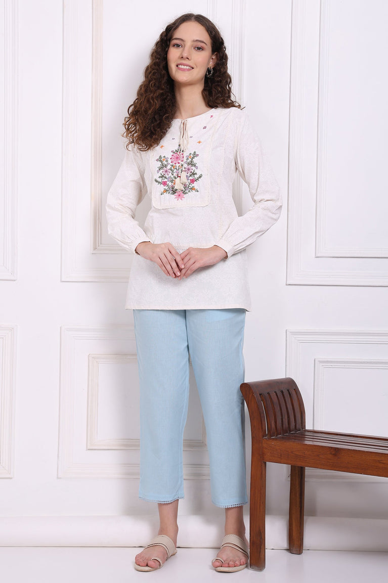 Add a touch of elegance to your everyday style with this textured cotton top with embroidered yoke. Crafted from soft and breathable pure cotton, the top features a subtle self-textured weave that enhances its visual appeal. Intricate tonal embroidery on the front lends a refined, handcrafted charm, while the delicate lace accents along the neckline and sleeves add a feminine finish. Designed in a relaxed silhouette for ease and comfort, this versatile piece is perfect for work, casual outings, or summer brunches. Pair it with jeans, trousers, or ethnic bottoms for a fresh and graceful look.