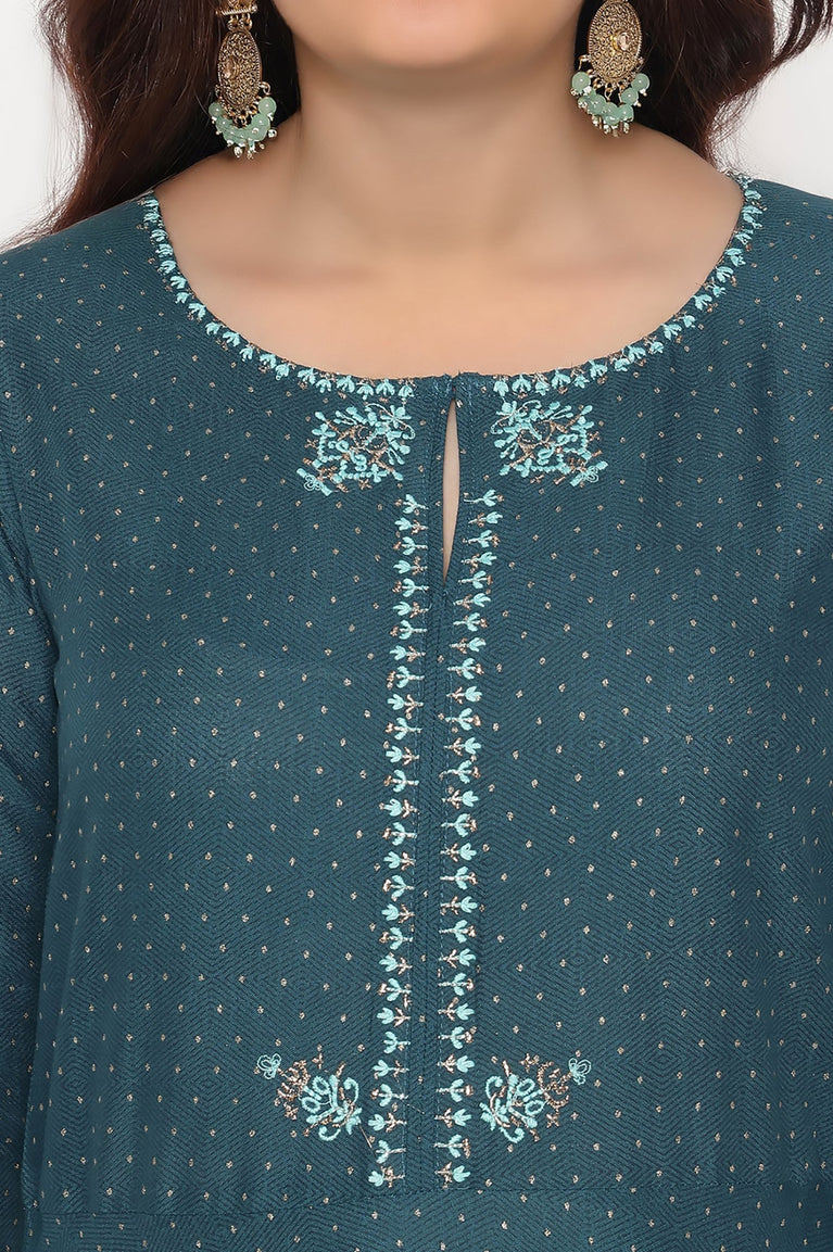 Crafted from lightweight rayon, this teal kurta set is designed for comfort and charm. The printed straight kurta and straight-fit pants make it ideal for casual functions or relaxed family events. A soft yet structured kurta set for women who value simplicity with a festive twist.