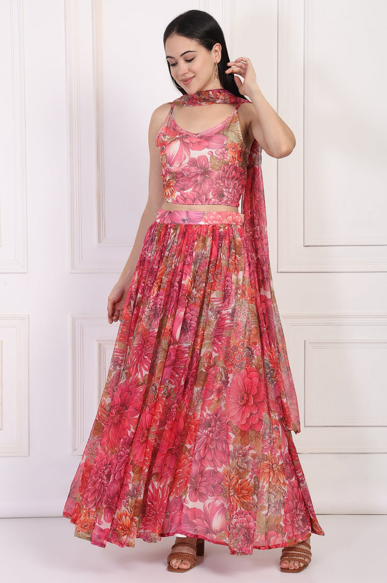 Pink Bold Floral Printed Embellished Georgette Spaghetti Crop Top with Flared Skirt and Dupatta Set