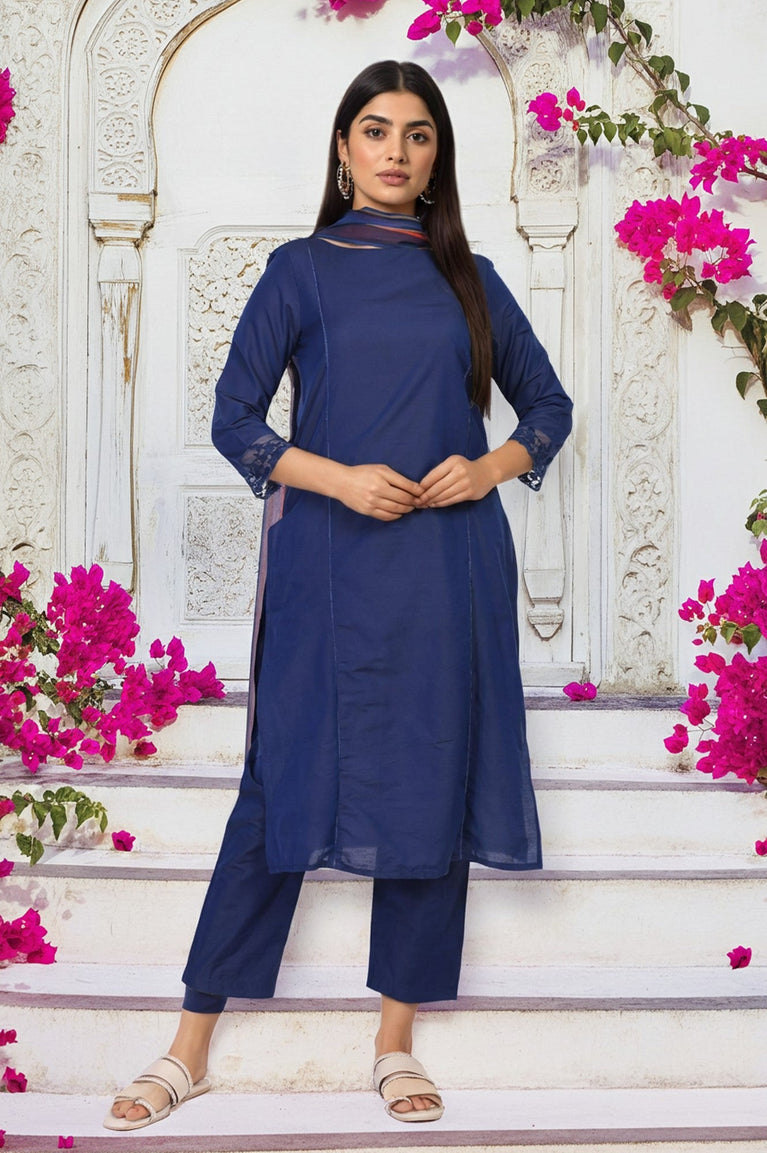 Navy Blue Solid Lace Trim Straight Kurta with Straight Pant and Dupatta Set
