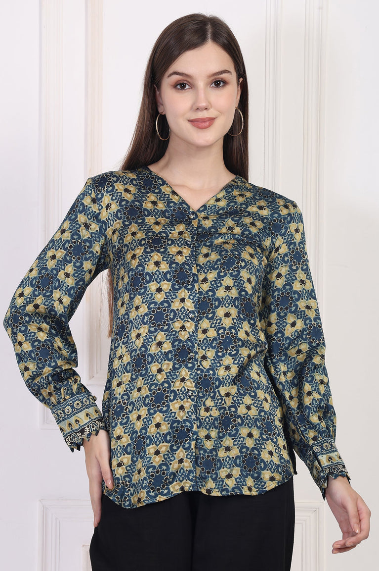Effortlessly chic! This modal top for women features a captivating abstract print in a rich blue hue, complemented by a mandarin collar and long sleeves. The button-down design adds a touch of sophistication, while the straight silhouette ensures comfort and versatility. Perfect for casual outings or office wear, this breathable modal top is a must-have for your wardrobe. Pair it with tailored trousers or jeans for a polished look that transitions seamlessly from day to night.