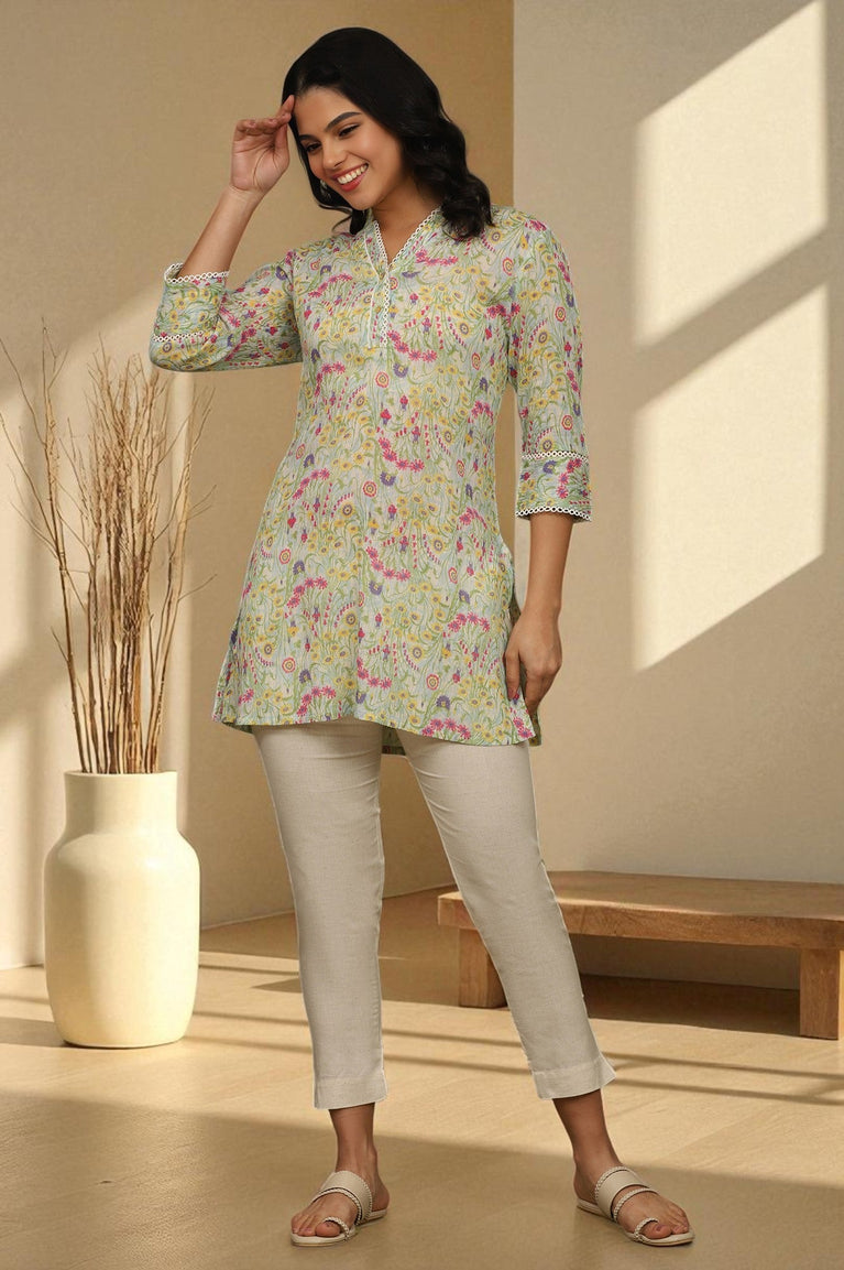 Blue Floral Printed Cotton Crepe Tunic with Lace