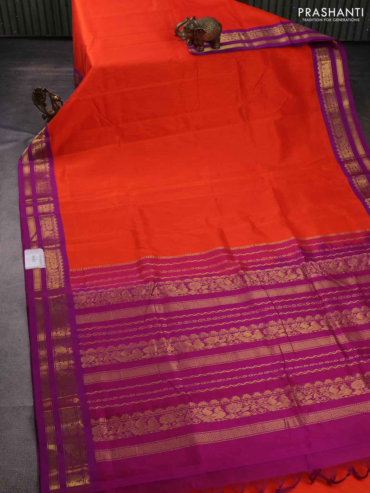 10 Yards silk cotton saree orange and purple with plain body and zari woven korvai border