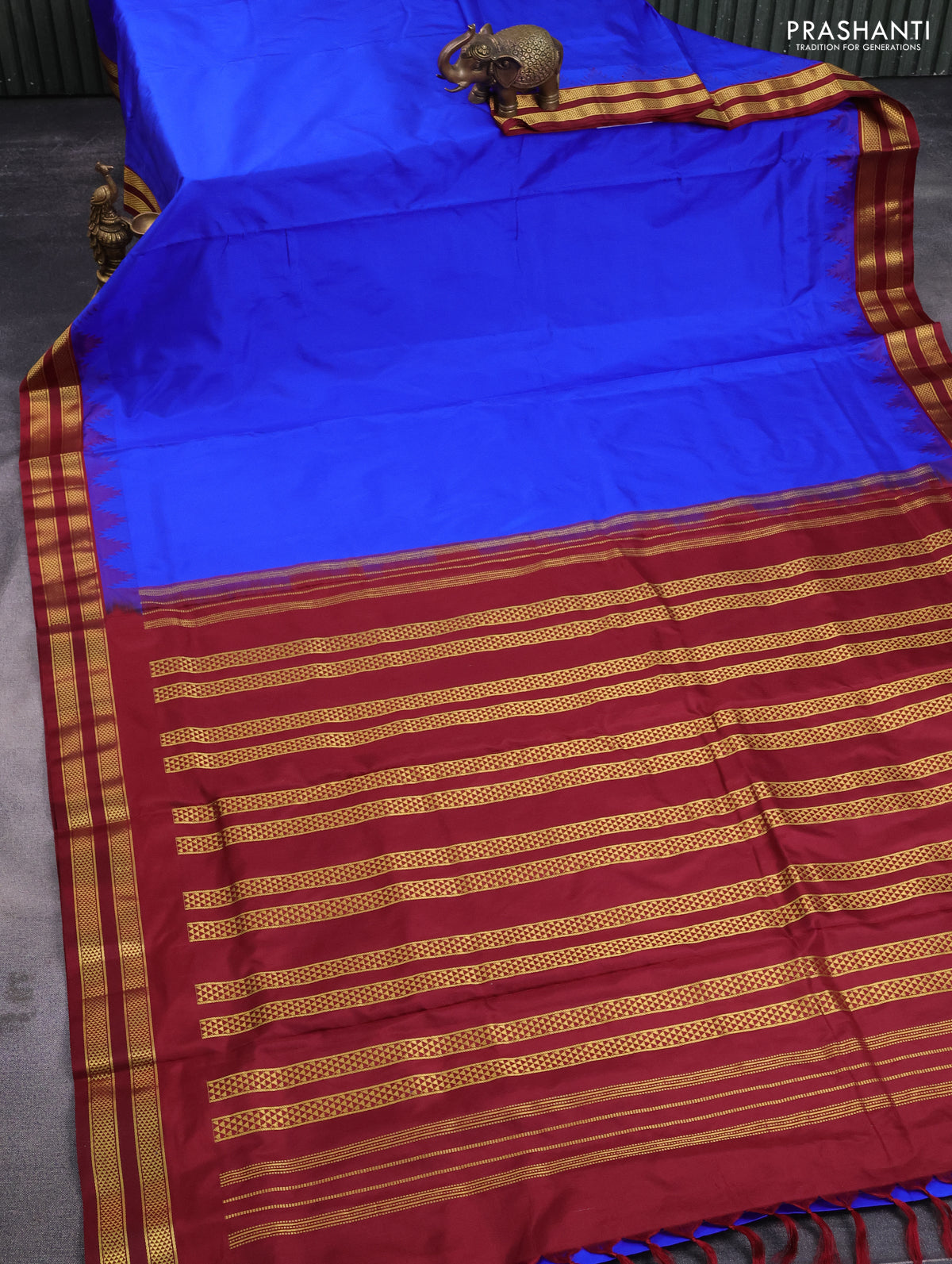 10 yards silk saree blue and maroon with plain body and temple design zari woven border