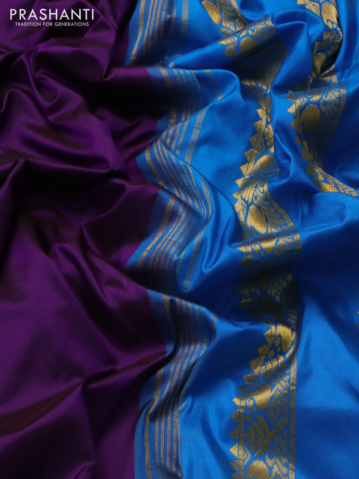 10 yards silk saree purple and cs blue with plain body and temple design rettapet zari woven border