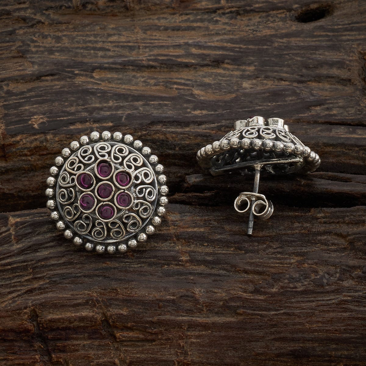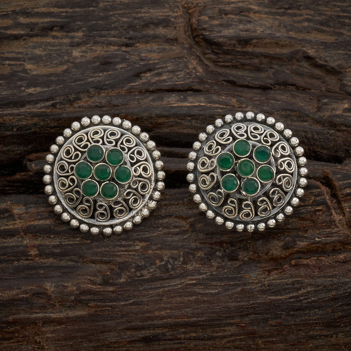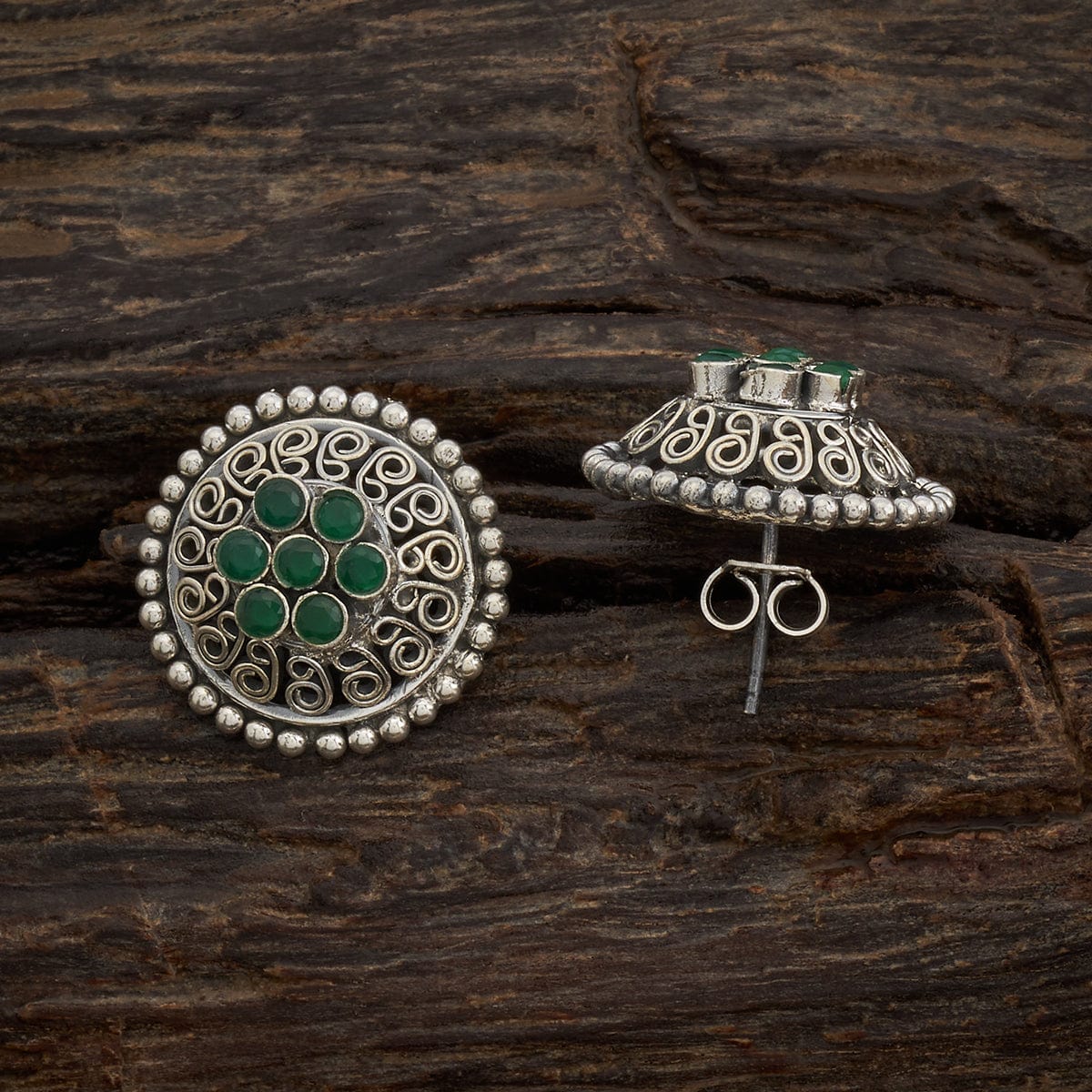 The best part of accessories with a polish of oxidised silver is that they blend well with traditional and fancy occasions, which is why we present our latest pair of 92.5 silver earrings in black polish. These stud earrings offer intricate work details with green and ruby stones, and the polish ensures to make all heads turn toward you.