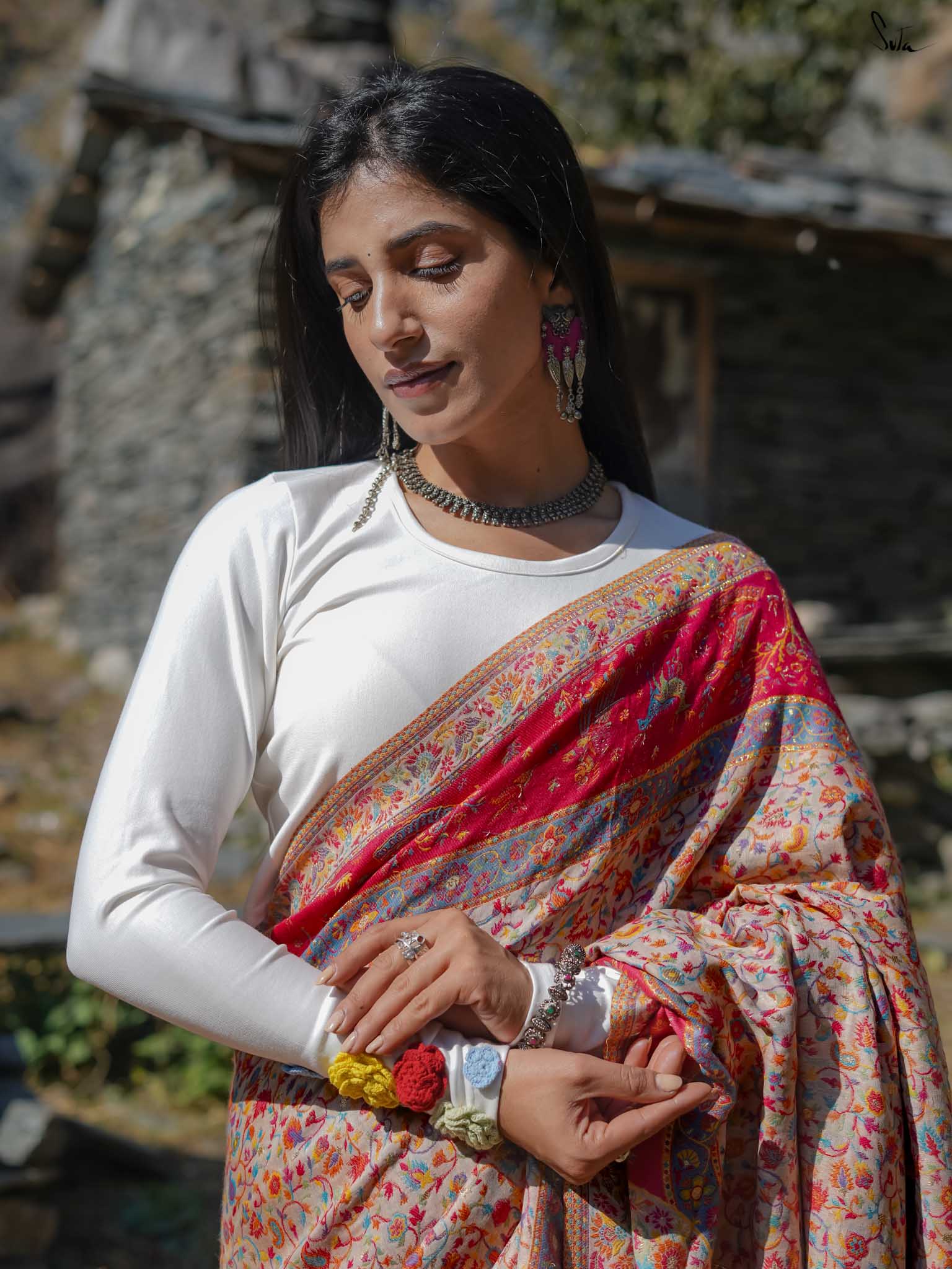 The clean round neckline and full sleeves give it a timeless appeal, while subtle crochet flower embellishments on the sleeves add a whisper of handcrafted charm. Pure, versatile, and endlessly wearable, it’s the blouse you’ll reach for again and again.