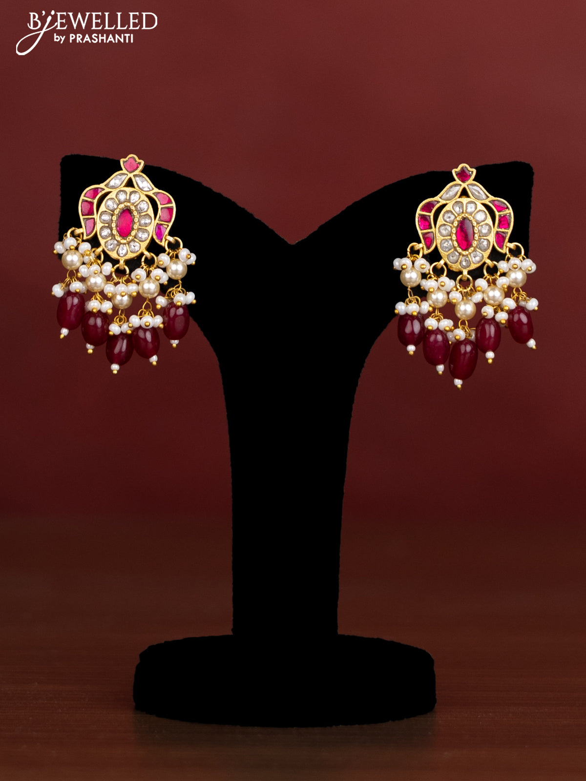 Antique beaded maroon necklace floral pendant with jadau kundan stones and pearl & beads hangings